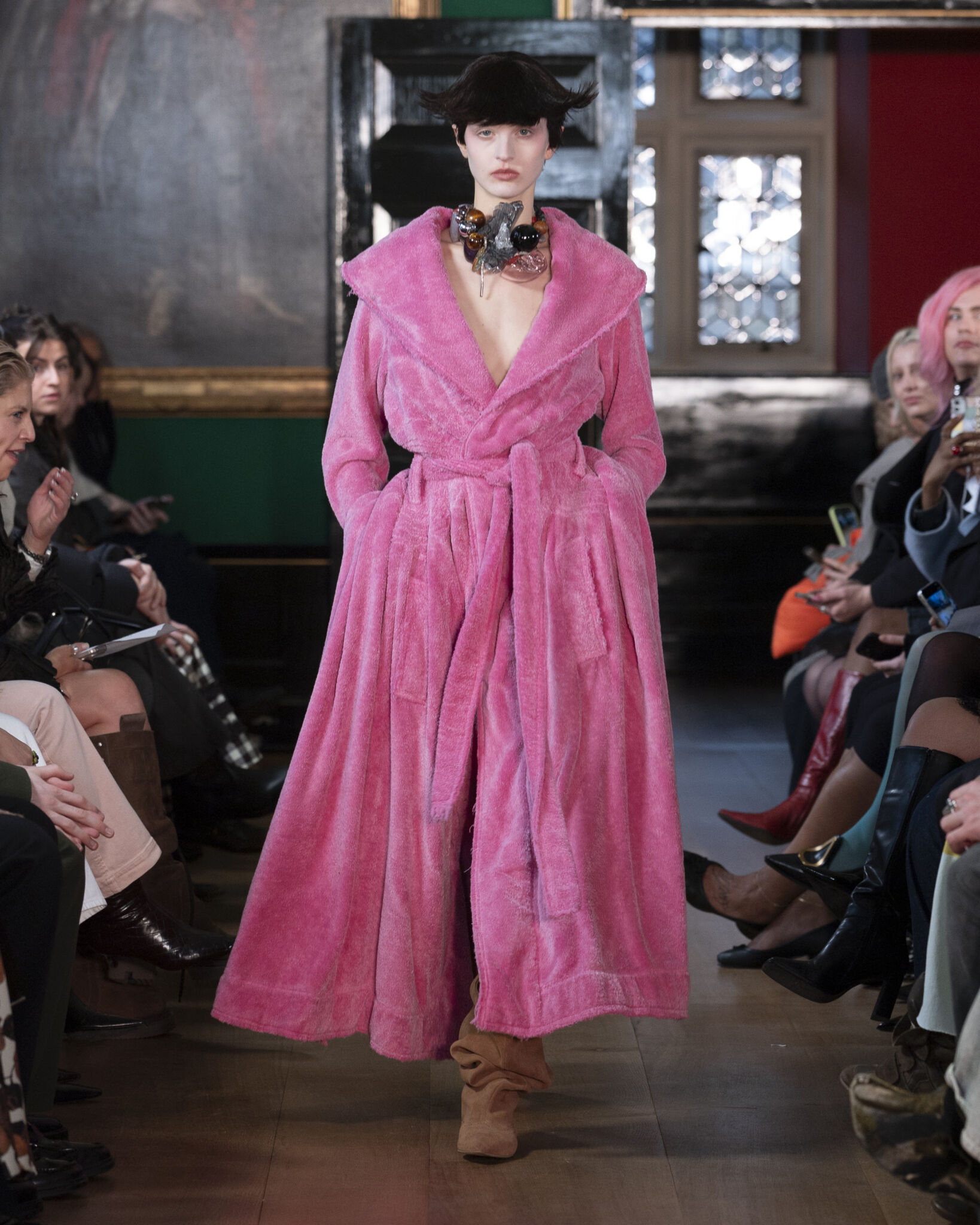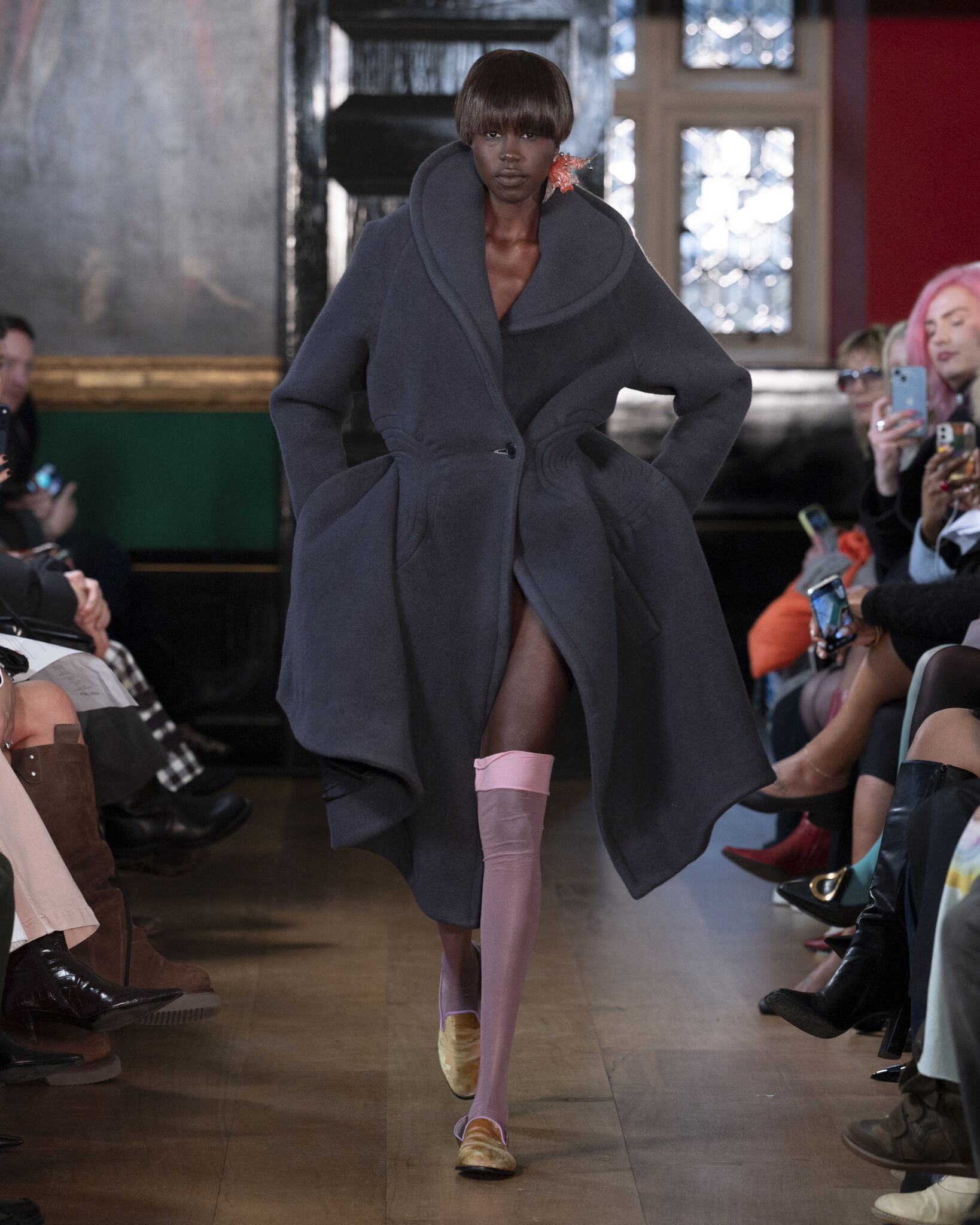 Throughout the collection, softness is balanced with assertive tailoring. A charcoal coat curves around the body with sculptural volume, protective without severity. Pink stockings interrupt the restraint with a subtle human detail.