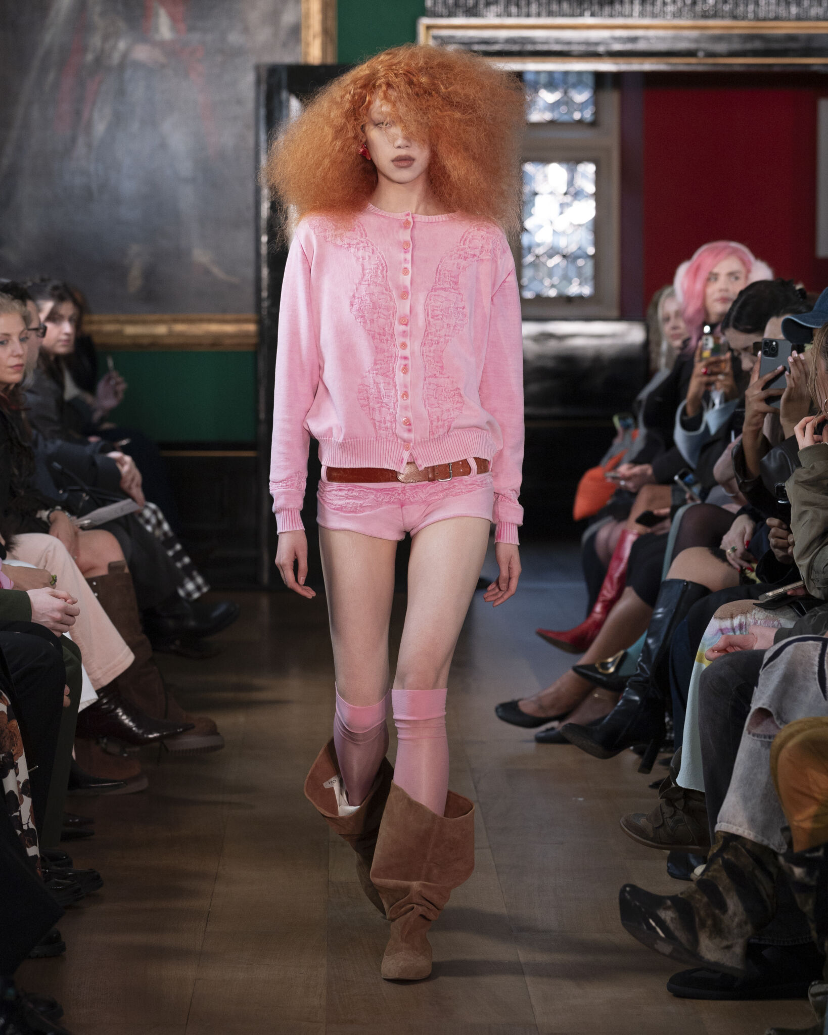The soft pink knit look introduces the mood: intimate and slightly nostalgic, yet composed. Bare legs paired with oversized boots create contrast, grounding softness with strength.