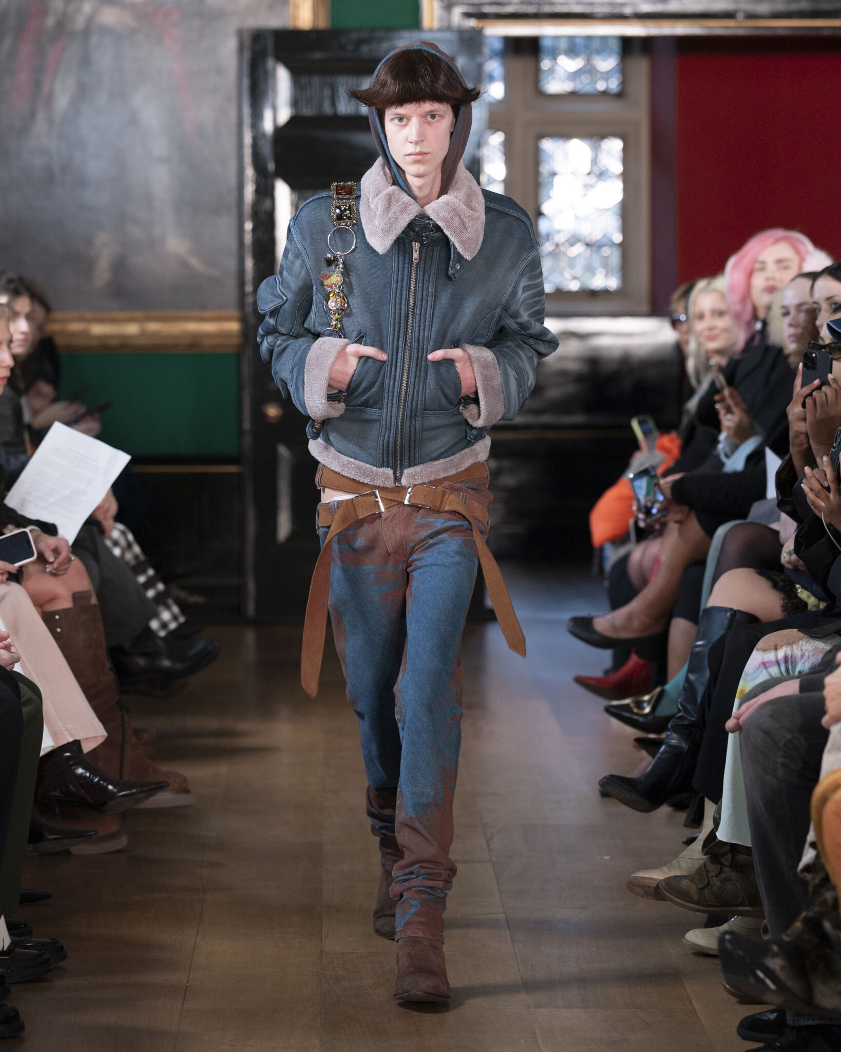 Denim remains central to the collection. It is brushed, treated and distressed to suggest wear rather than trend. Extended belts lengthen the silhouette, while jackets appear softened through use. The focus is less on youth culture and more on experience — clothing shaped by time.