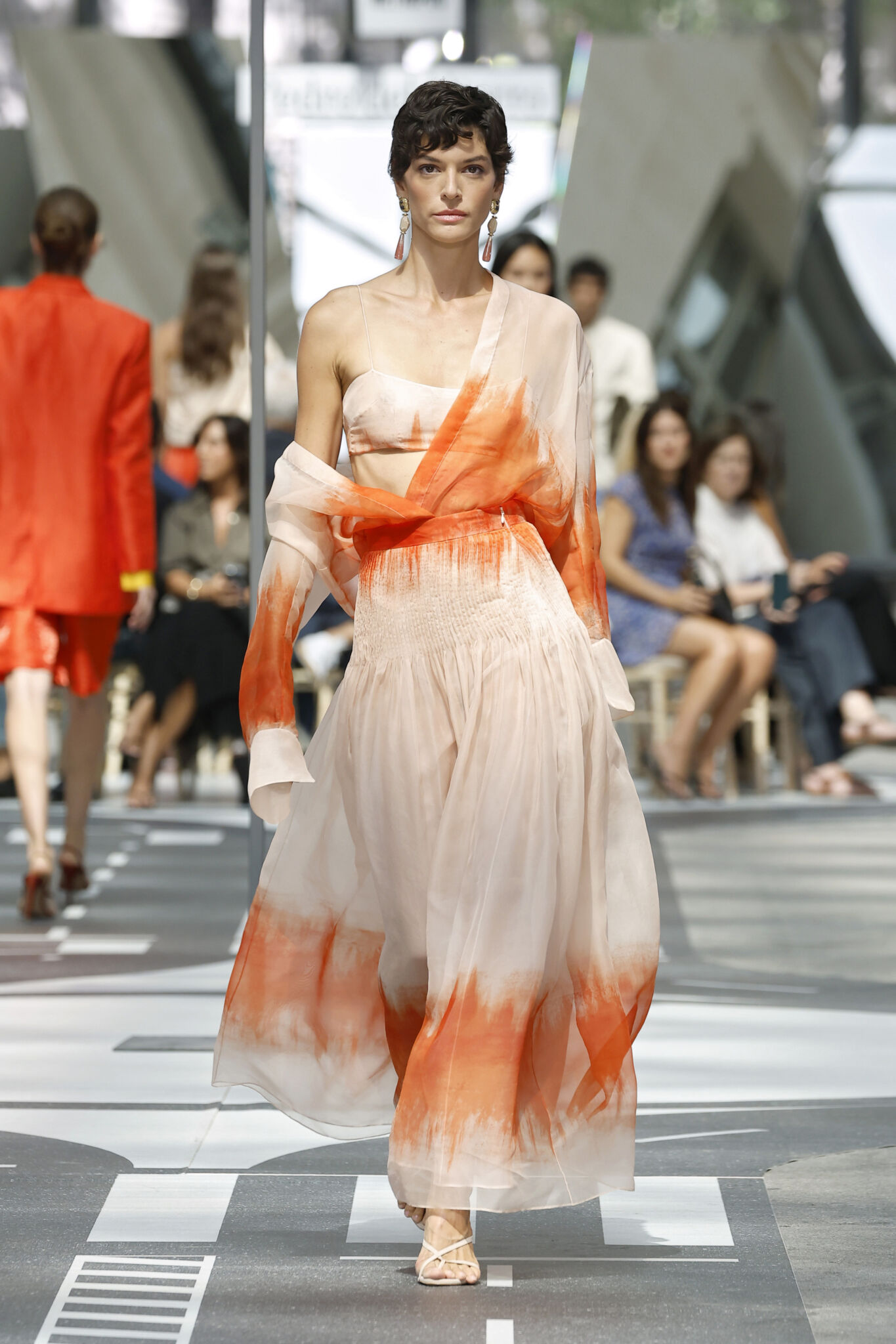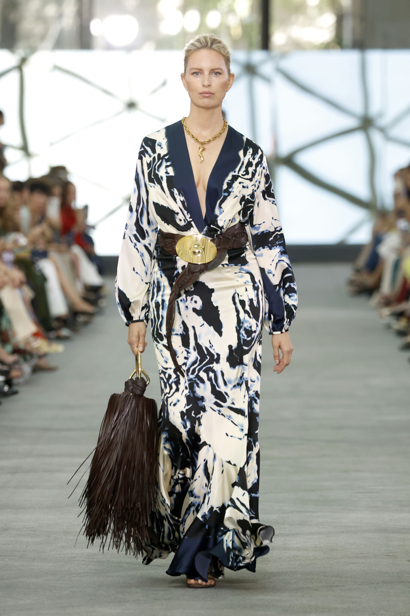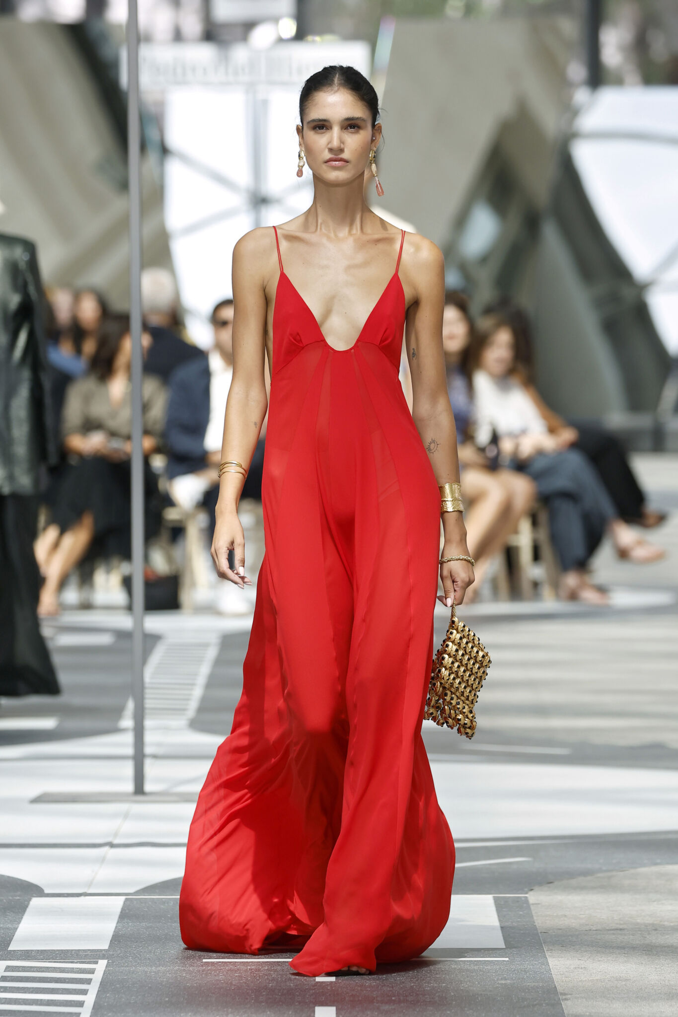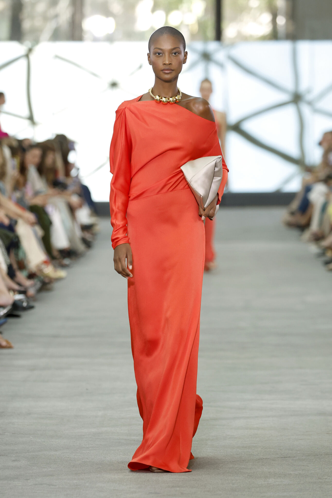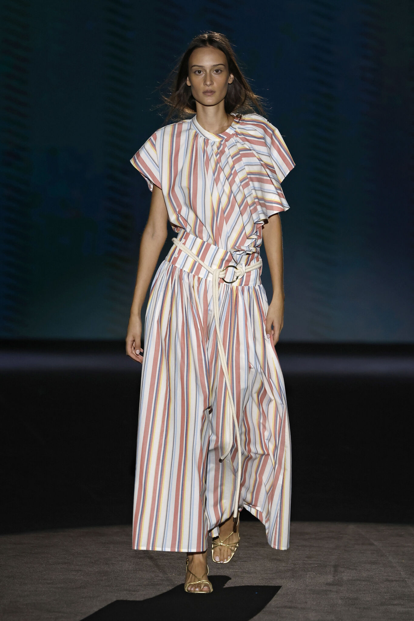 The spring-summer collection by the Colombian designer embodies her signature relaxed elegance, featuring graceful dresses crafted from flowing fabrics that create a sense of lightness and freedom. The color palette impresses with its diversity: from white, sky blue, and black to rich terracotta, lime green, and violet. A special emphasis is placed on the combination of orange and fuchsia, which feels unexpectedly fresh and dynamic. Ombre-effect dresses add poetic depth and visual sophistication to the lineup, while the striped print becomes one of the central motifs, highlighting the graphic nature of the looks. Exquisite accessories take center stage, with standout pieces including pouch bags and clutches adorned with long fringe. These playful elements infuse the looks with movement and a subtle bohemian flair, while fringe itself emerges as a key decorative feature.