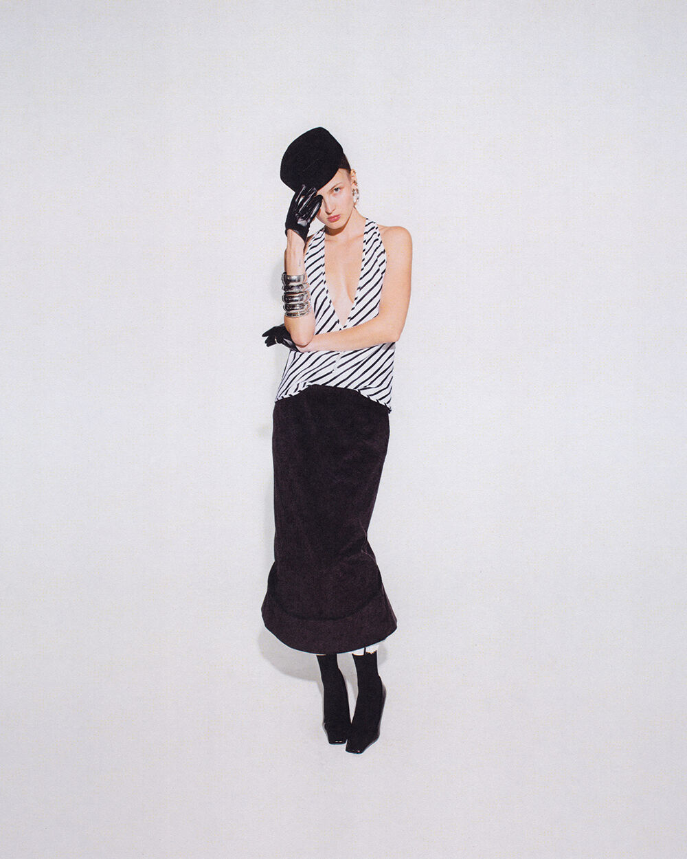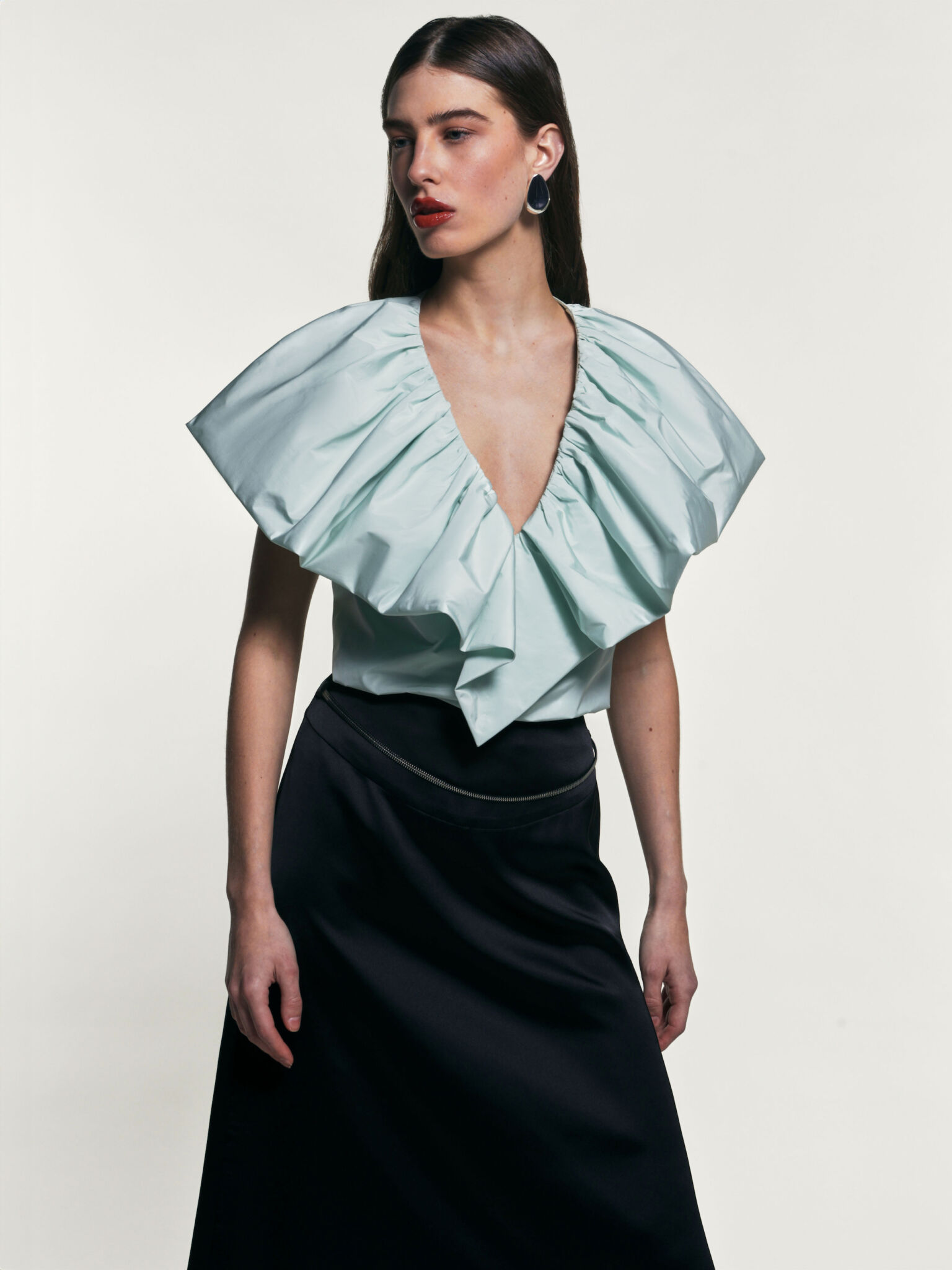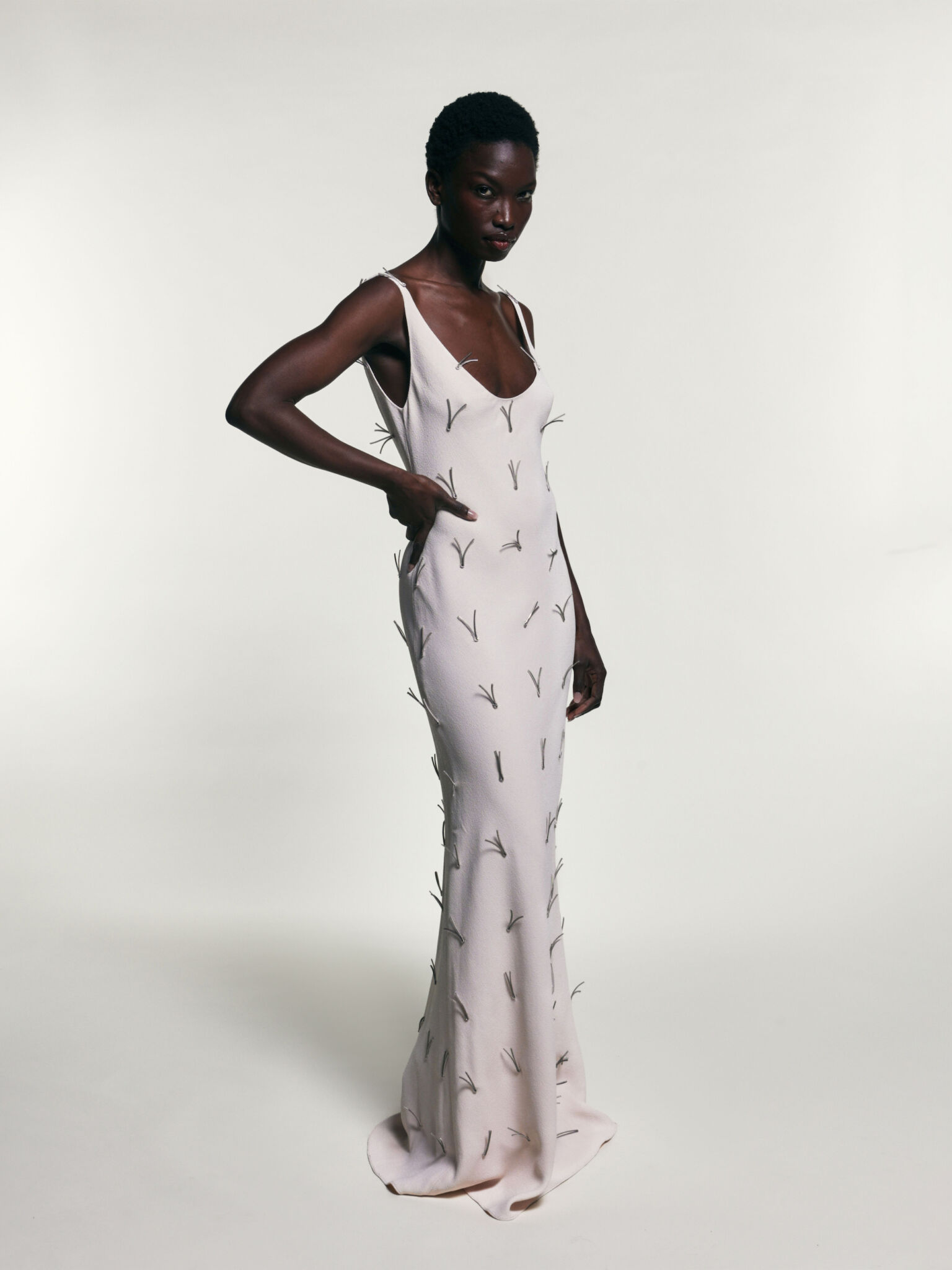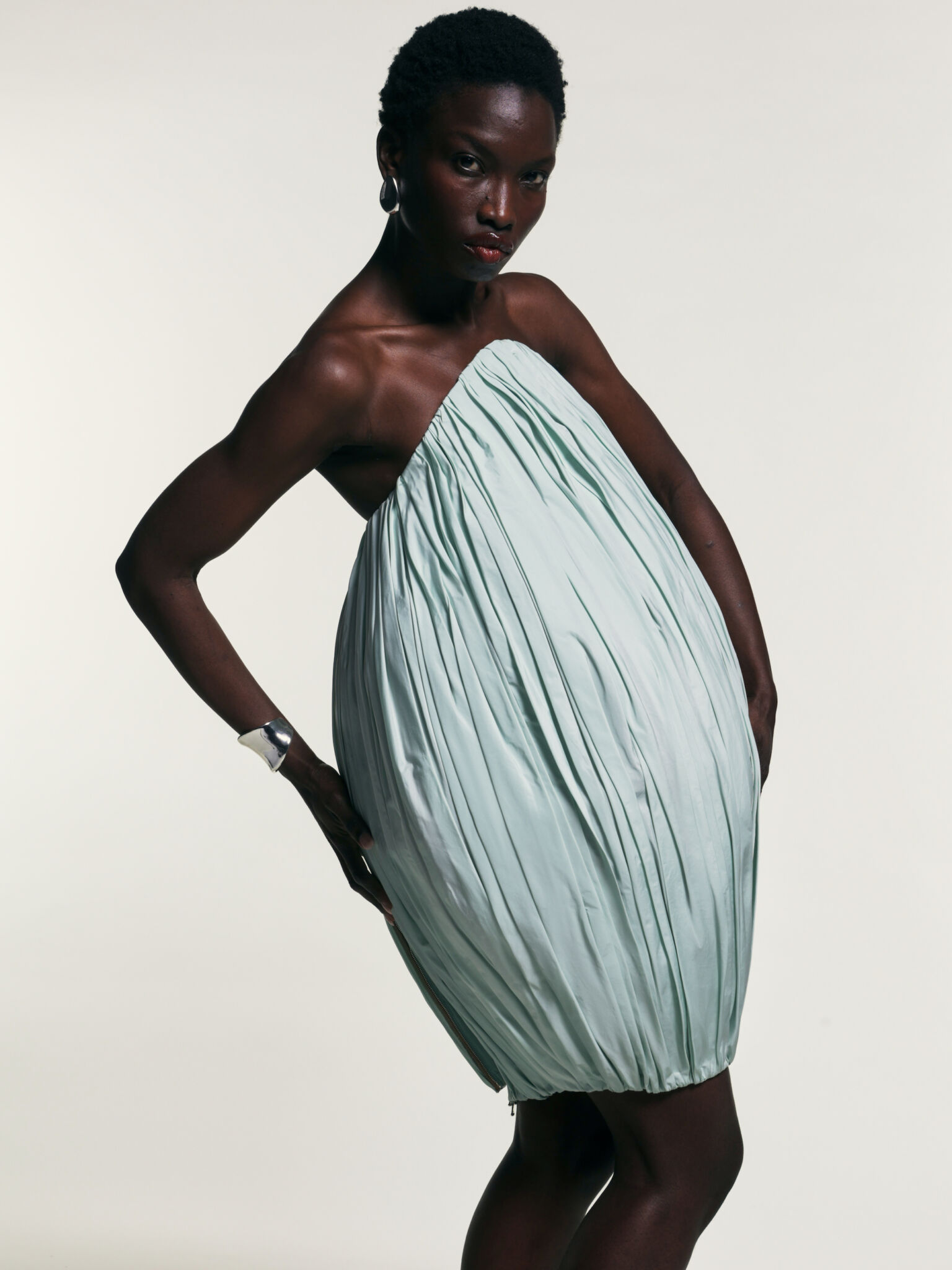 В коллекции — воображаемый космический эпос, вдохновленный астрономической мифологией. Дизайнер интерпретирует бескрайность галактики через призму собственной эстетики, соединяя небесную символику с образом титана Атлас, удерживающего свод небес. Линия развивается от четкого, выразительного кроя и скульптурных рубашек к текучим драпировкам и архитектурно выстроенным формам. Силуэты с подчеркнутыми пропорциями и гипертрофированными деталями дополнены насыщенными фактурами и трехмерными сферическими элементами. В вечернем блоке бренд представляет разработанные перья из молний, а также металлические акценты в виде цепочек и деликатной отделки швов. Кульминацией становится мини-платье, полностью собранное из цепочек-молний и смоделированное непосредственно по телу, превращая утилитарный элемент в скульптуру. При всей экспериментальности, линейка сохраняет носибельность, предлагая образ леди, уверенной в себе, гиперженственной и свободной в стремлении к выразительности.