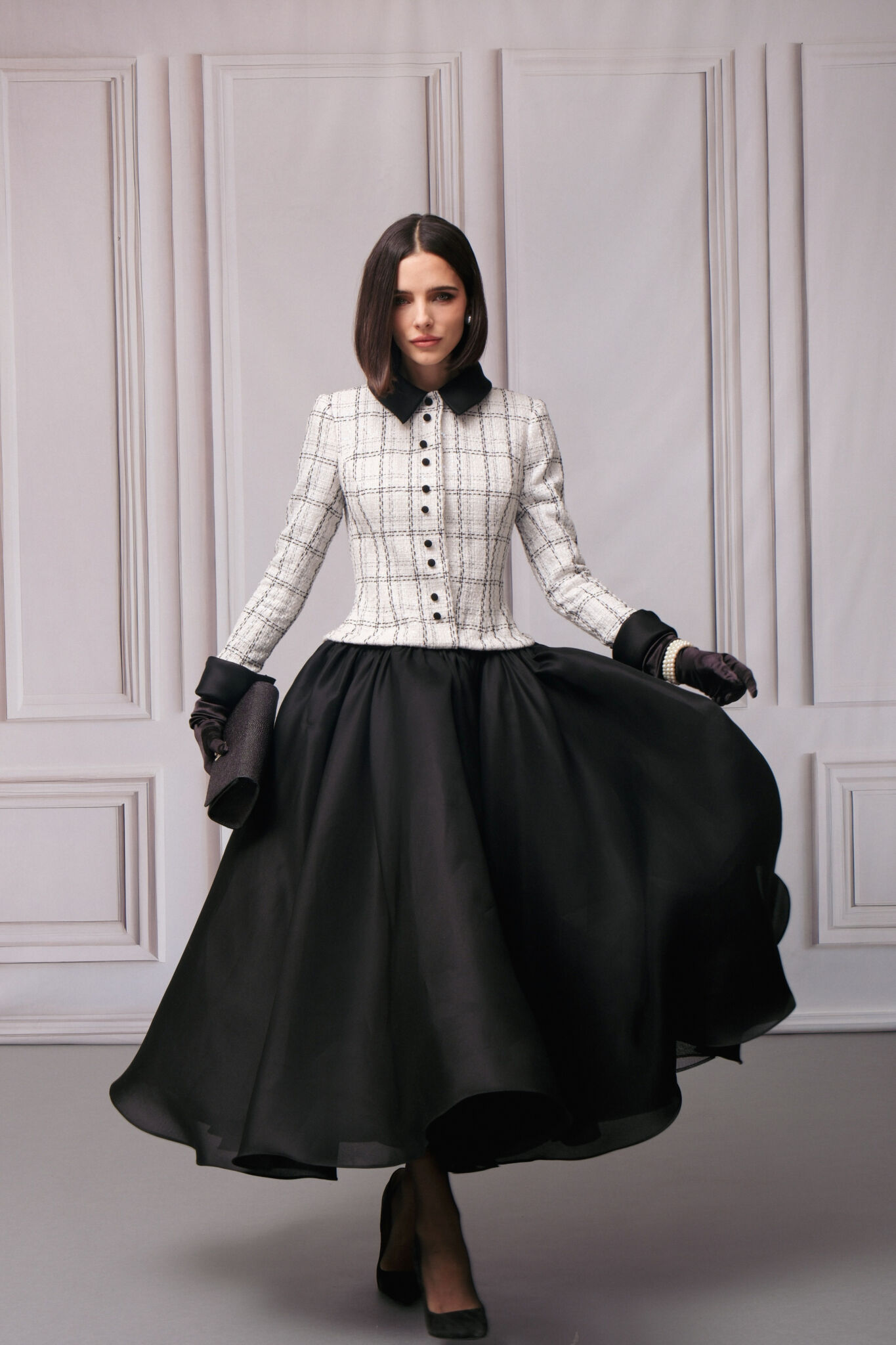 Самая дерзкая и театральная коллекция в истории бренда, развернулась как ностальгическая ретро-вечеринка в скрытом ювелирном театре в Мидтауне Манхэттена. Пространство показа напоминало мгновение бегства от зимнего холода — шаг из морозного города в зал, залитый огнями диско, запахом торта и ожиданием Дня рождения. Атмосфера игры и притворства задала тон всей коллекции, в которой одежда превращается в инструмент самовыражения. Знаковая клетчатая кружевная ткань бренда вновь появилась в диалоге с пайетками и новыми фактурами, усиливающими эффект блеска. Контрастные цветовые сочетания и подчеркнутая сияющая поверхность придали образам нарочитую сценичность. Гиперболизированные пропорции и неожиданные силуэты подчеркнули мотив переодевания и перформативности.