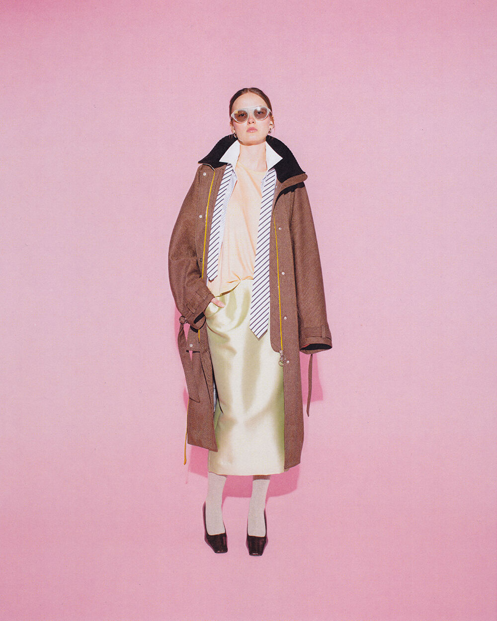 В центре повествования — история азиатского труда, первая волна китайских рабочих, строивших трансконтинентальные железные дороги США в XIX веке. Бренд рассматривает их опыт как непрерывную линию, соединяющую поколения иммигрантов прошлого и сегодняшних азиатских американцев. Основу коллекции формируют силуэты рабочей одежды с функциональным кроем, усиленными швами и множеством карманов — отсылка к физическому труду и одновременно к невидимой эмоциональной и институциональной нагрузке, которую несут современные сообщества. Вторым пластом становятся 1980-е годы с их жeсткими плечами, строгим тейлорингом и юбками-карандашами, отражающими дисциплину и амбиции в пространствах корпоративной Америки. Утилитарные формы выполнены в тканях с шелковистой отделкой и глянцевым блеском, создавая контраст между исторической невидимостью и сегодняшней заявленной публичностью. Коллекция выстраивает траекторию трансформации труда — от физического к интеллектуальному и культурному, подчeркивая его растущую видимость и значимость.
