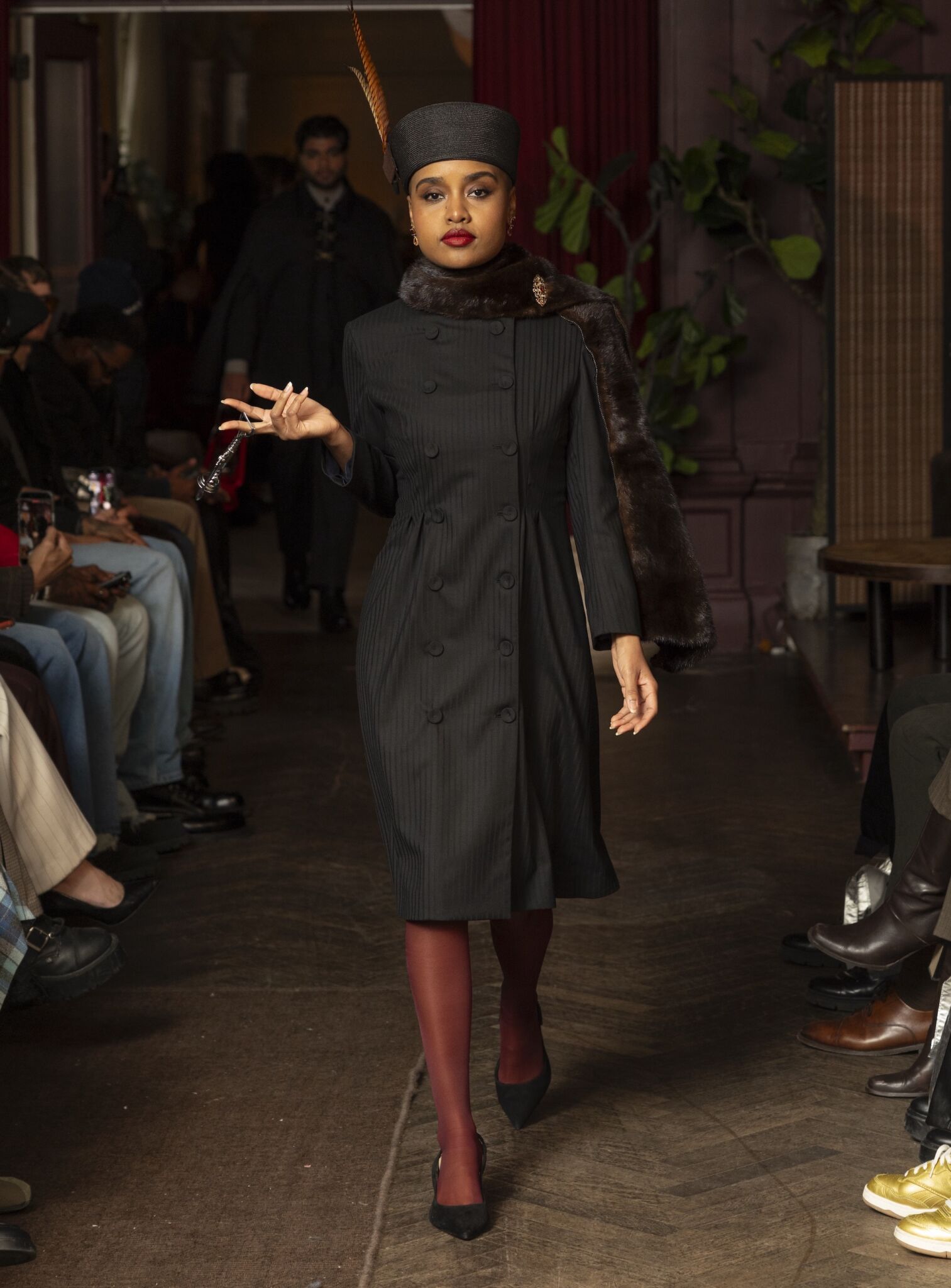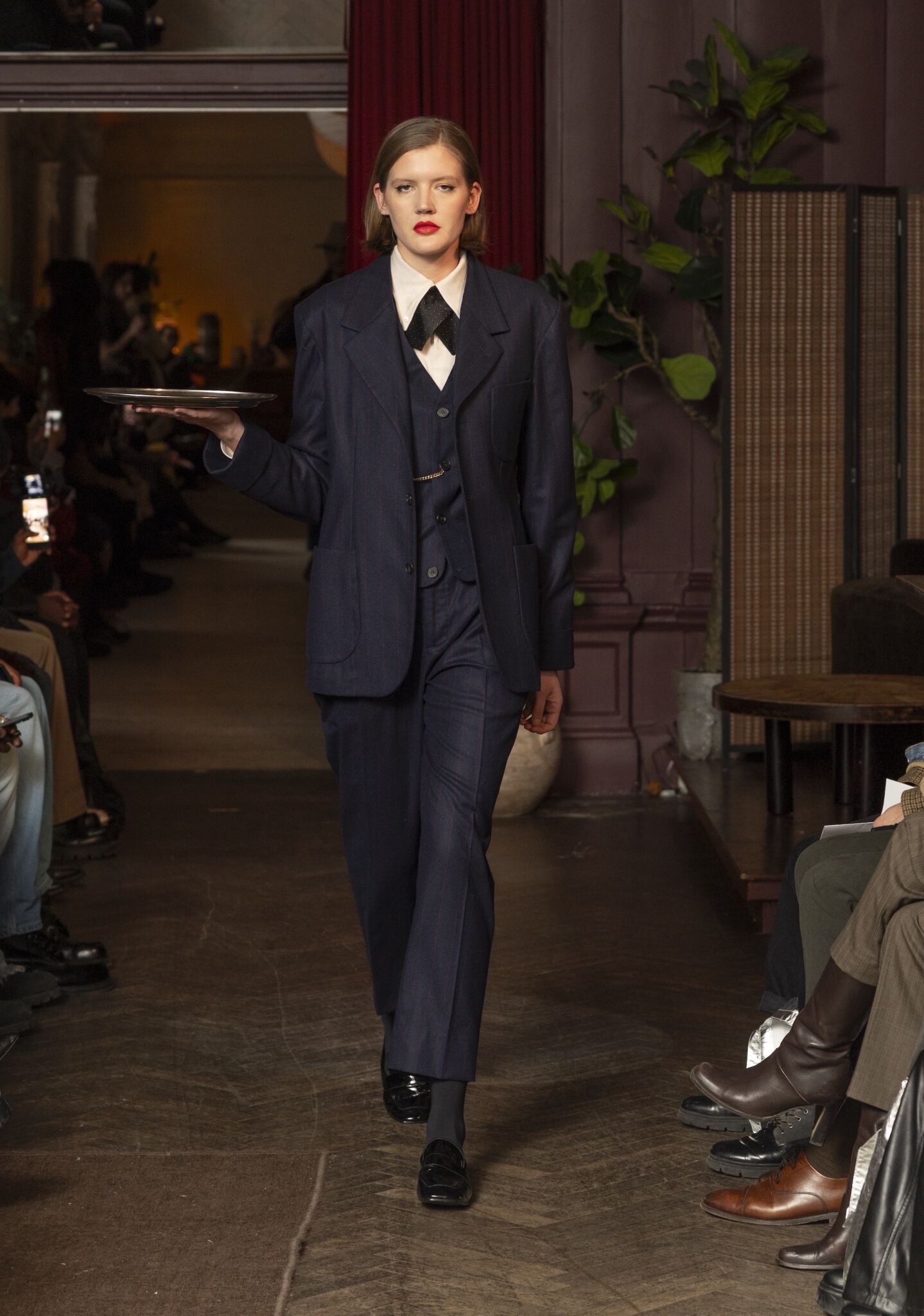 Бруклинский бренд показал «Убийство в поместье Сиван», коллекцию-театральный спектакль в антураже 1930-х. Самая драматичная линейка марки на сегодняшний день обращается к эстетике классического детектива, где соблазнительная атмосфера, расследование деталей и безупречный крой складываются в единый сценарий. С ироничной интонацией дизайнер предлагает через условность детективной интриги говорить о серьезных вопросах ответственности и предвзятости. Каждый образ выступает самостоятельным персонажем — узнаваемым, но намеренно оставляющим пространство для сомнений в его «вине». Кастинг продолжил ательерную философию бренда: модели подбираются заранее, чтобы создавать одежду с учетом индивидуальности и телосложения каждого участника показа. Среди героев подиума — паралимпийский чемпион Стив Серио, актeр и спикер Обри Смоллс и журналистка Лорен Эзерски, усилившие ощущение многослойной, почти кинематографичной истории.