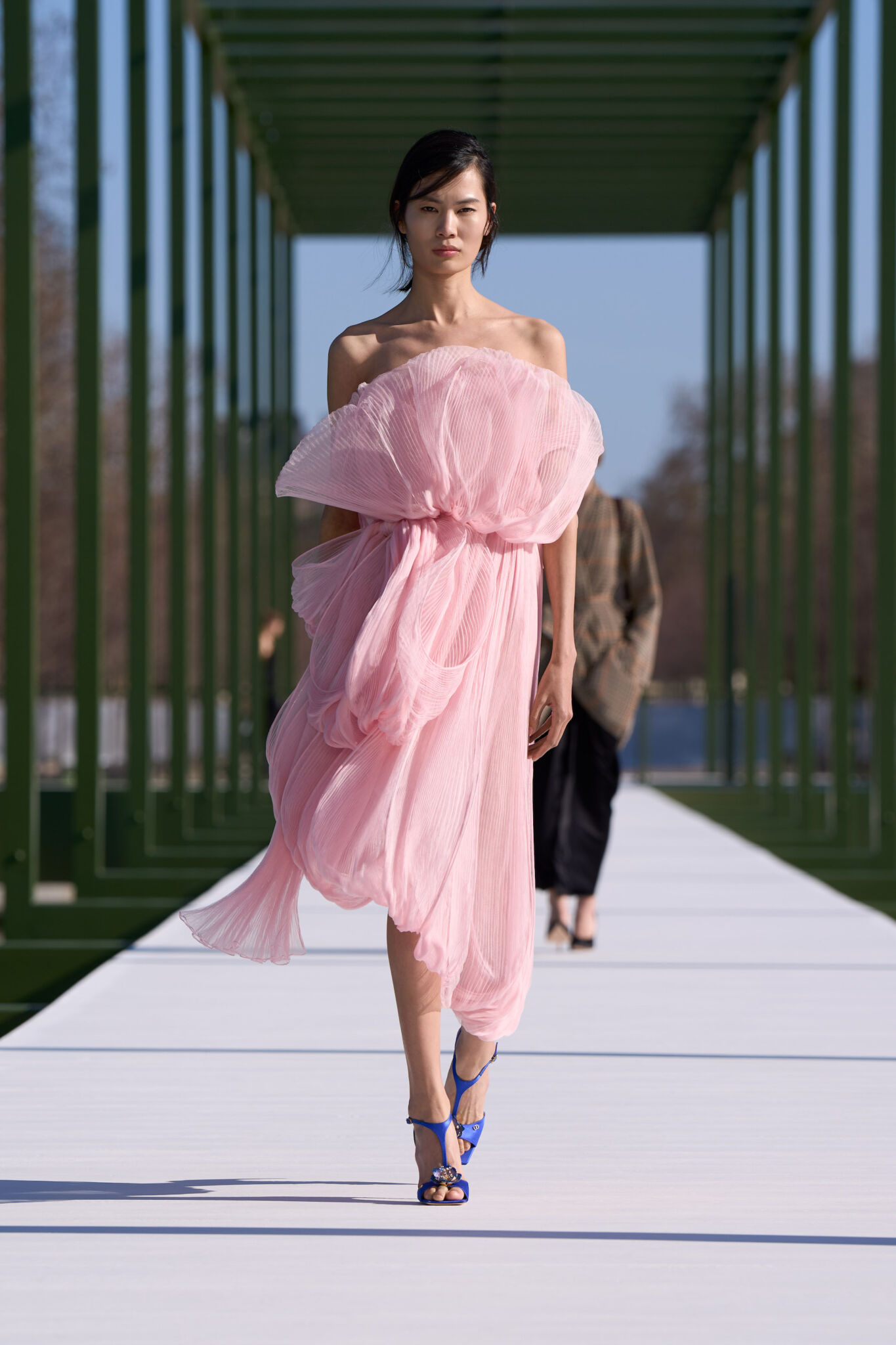 Образы включают разные современные типажи и складываются в многоголосый портрет парижской публики — от сдержанной повседневности до эффектной театральности. Цветовые акценты словно вспыхивают среди строгой геометрии пространства, подобно цветам в партерных садах. Они оживляют и создают ощущение движения, словно одежда растворяется в ритме города. Андерсон переосмысляет парижский гардероб в том числе через призму наследия дома. В образах отчетливо читаются архивные коды бренда — жакет «Бар», платье «Юнона», цветы во всех проявлениях и богатые ткани, которые отсылают к исторической эстетике Dior. На подиуме появляются силуэты с юбками, напоминающими балетные пачки, дополненные блеском стразов, перьями и сложными брокатами. Среди декоративных элементов использованы рюши, а уравновешиваются они денимом и драматическими пальто. Цветочные мотивы и струящиеся формы создают ощущение движения, словно повторяя ритм прогулки по парижскому саду.