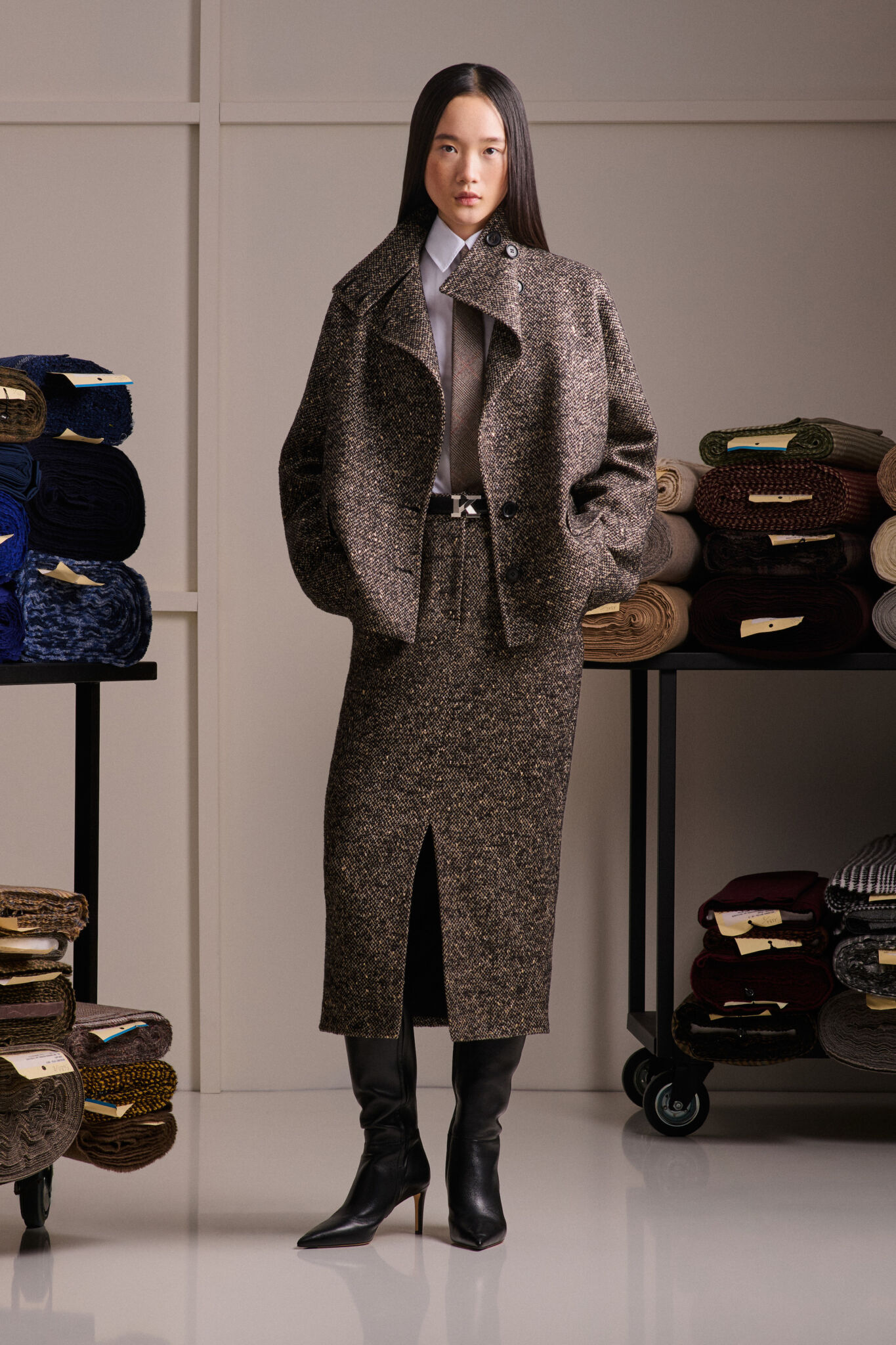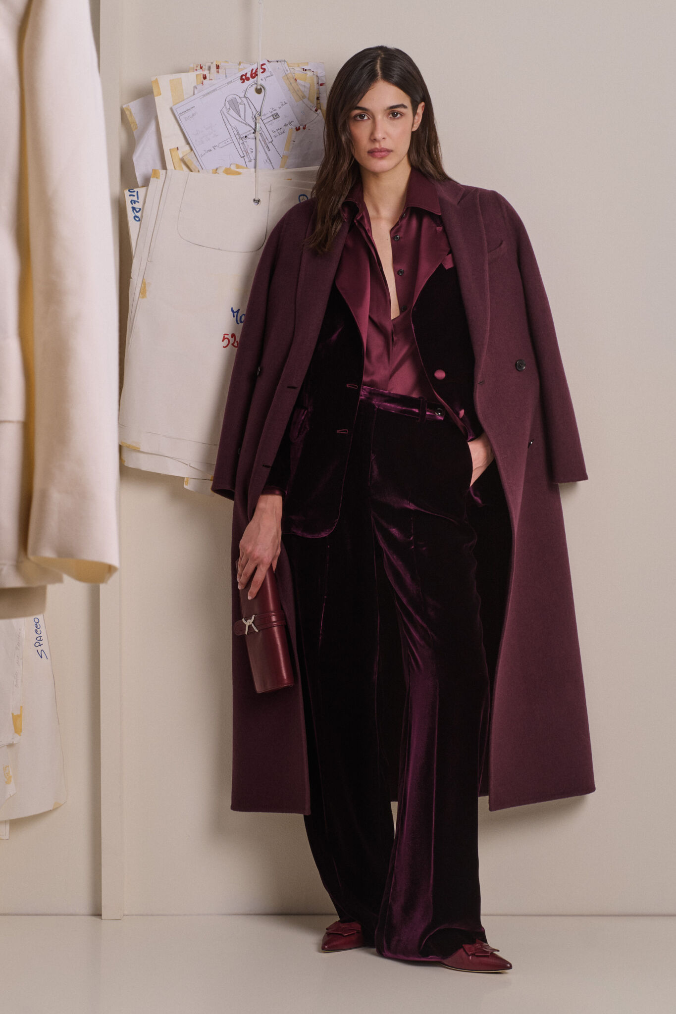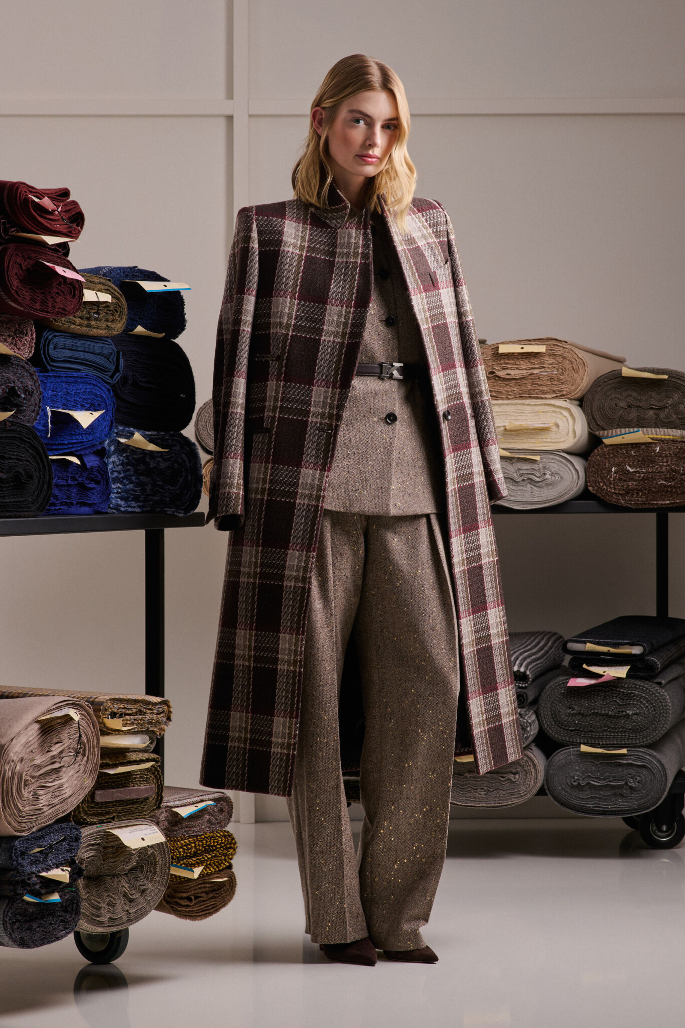 Отправной точкой в новой коллекции становится костюм в его классическом триединстве — жакет, галстук и брюки — представленный через мягкие объемы, пластичность линий и современные пропорции, где строгая структура уравновешена свободой. Тонкая отсылка к английскому тейлорингу и гардеробу герцога Виндзорского проявляется в гусиной лапке и клетке, в укороченных брюках с увеличенным объемом и четком, но не жестком плече. Материалы — изюминка коллекции — шотландская шерсть в монохромных ансамблях, деликатное золотое букле и вертикальные пальто из чистого кашемира формируют сдержанную, внутренне собранную женственность. Цветовая палитра строится вокруг теплых земляных и верблюжьих оттенков, электрических синих и глубоких коричнево-черных нюансов с живописным анималистичным подтоном. Важную роль играет трикотаж — фактурные кашемировые пуловеры, кейпы с бахромой, инновационные вязаные воротники, а также эксклюзивные двойные ткани из викуньи и гуанако, где ремесленная техника соединяется с чувственностью.