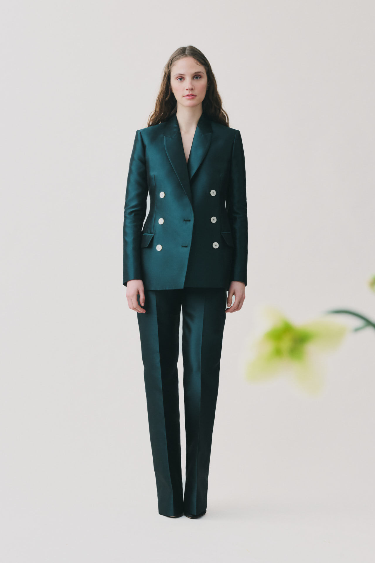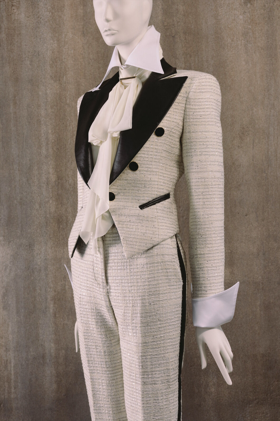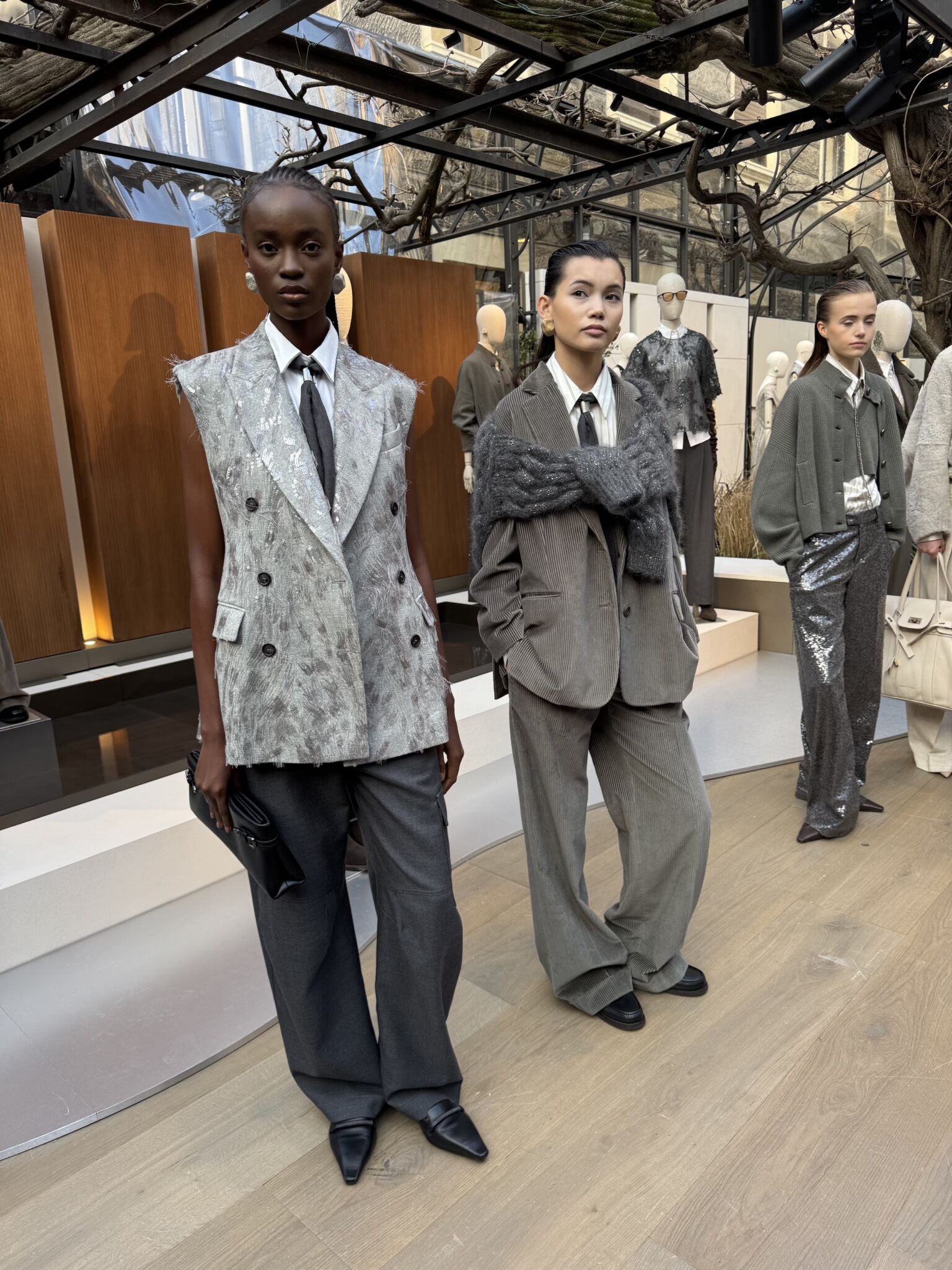 Отправной точкой в новой коллекции становится костюм в его классическом триединстве — жакет, галстук и брюки — представленный через мягкие объемы, пластичность линий и современные пропорции, где строгая структура уравновешена свободой. Тонкая отсылка к английскому тейлорингу и гардеробу герцога Виндзорского проявляется в гусиной лапке и клетке, в укороченных брюках с увеличенным объемом и четком, но не жестком плече. Материалы — изюминка коллекции — шотландская шерсть в монохромных ансамблях, деликатное золотое букле и вертикальные пальто из чистого кашемира формируют сдержанную, внутренне собранную женственность. Цветовая палитра строится вокруг теплых земляных и верблюжьих оттенков, электрических синих и глубоких коричнево-черных нюансов с живописным анималистичным подтоном. Важную роль играет трикотаж — фактурные кашемировые пуловеры, кейпы с бахромой, инновационные вязаные воротники, а также эксклюзивные двойные ткани из викуньи и гуанако, где ремесленная техника соединяется с чувственностью.