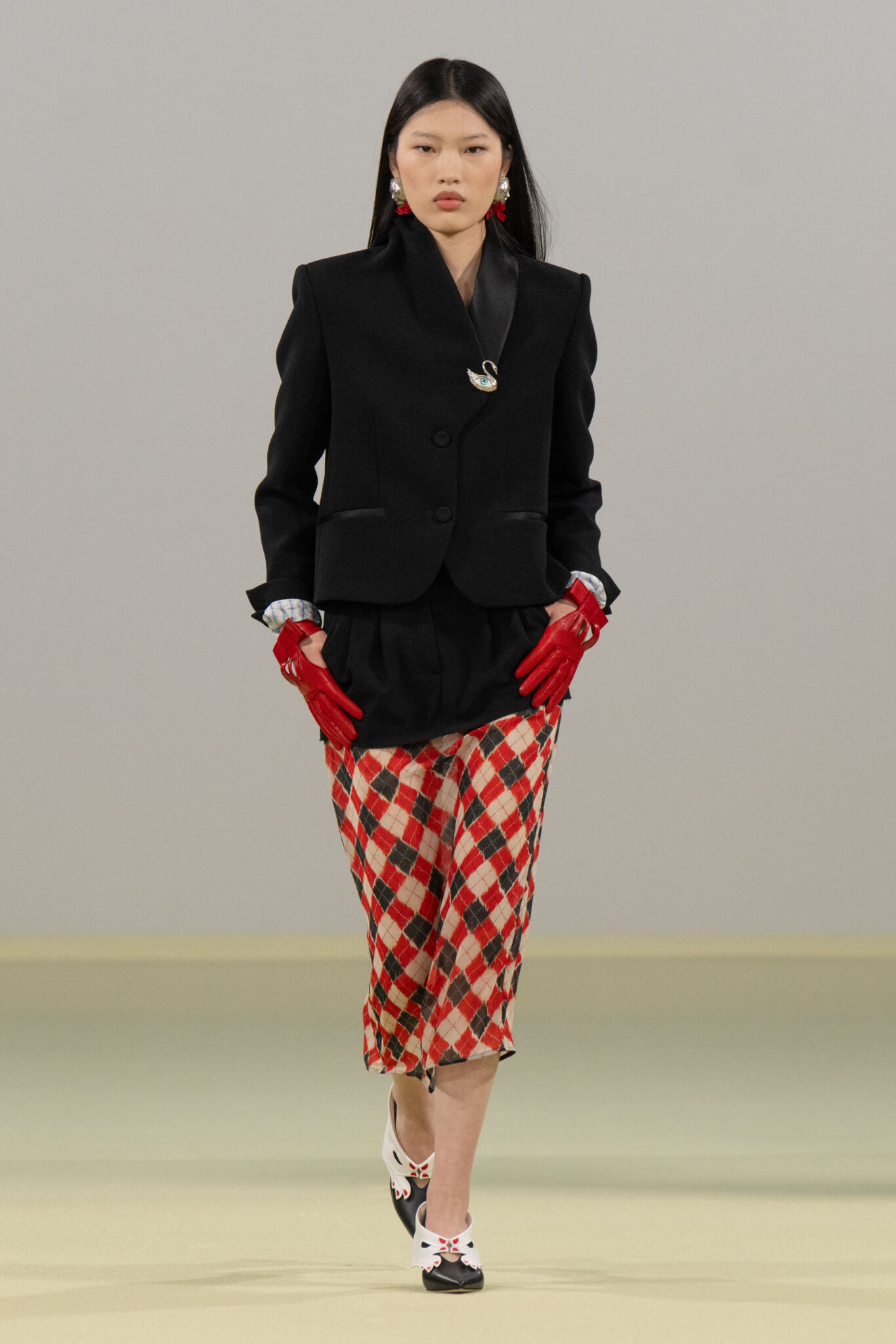 Бренд развернул воображаемый готический бал — пространство между реальностью и подсознанием, где личина и подлинность теряют границы. Отголоски легендарного Черно-белого бала Трумана Капоте переплетаются с тяготением к сюрреализму. Силуэты балансируют между британской строгостью и театральной экспрессией: безупречный тейлоринг в духе английской леди, аргайл-ромбы в виде вышивки, чистые конструкции, переходящие в неожиданные объемы, драпировки и банты, словно возникшие из сна. Знаковые профили лиц, навеянные эстетикой Сальвадора Дали и перекликающиеся с живописными образами Рафала Ольбинского, воплощаются в вышитых жакетах, болеро и скульптурном трехмерном платье. Образ лебедя — символа грации и метаморфозы — проходит через одежду и аксессуары в бархатистых трехмерных вышивках, появляясь на перчатках, масках и обуви, достигая кульминации в финальном выходе с драматичным шлейфом. Структурная шерсть вступает в диалог с органзой, подвижными плиссе и нейлоновой тафтой, вставки с эффектом меха на прозрачных комбинациях создают напряжение между хрупкостью и инстинктом. А мужская линия, дебютирующая на подиуме, вносит более острый ритм, играя на контрасте оверсайз-объемов и четких линий и тонко размывая границу между формальным и повседневным.