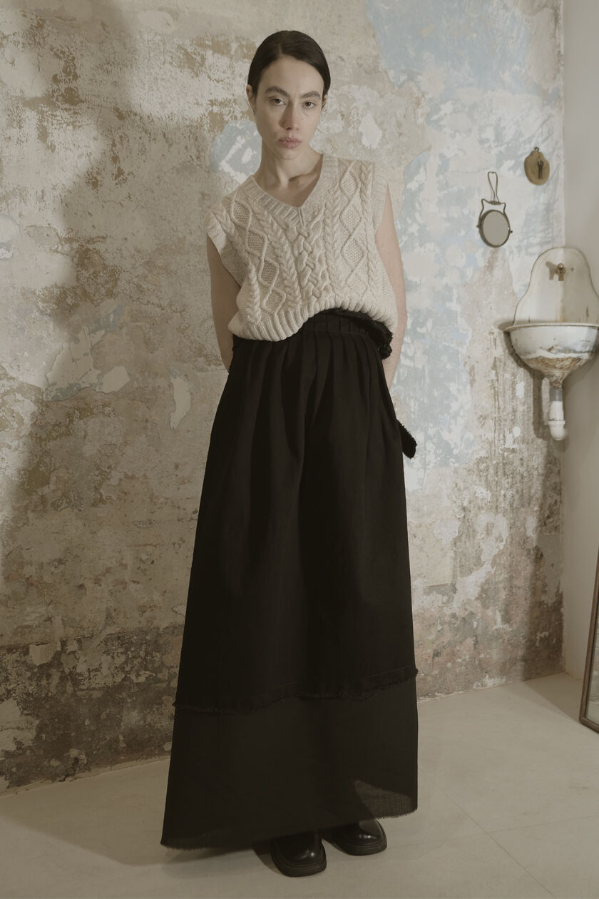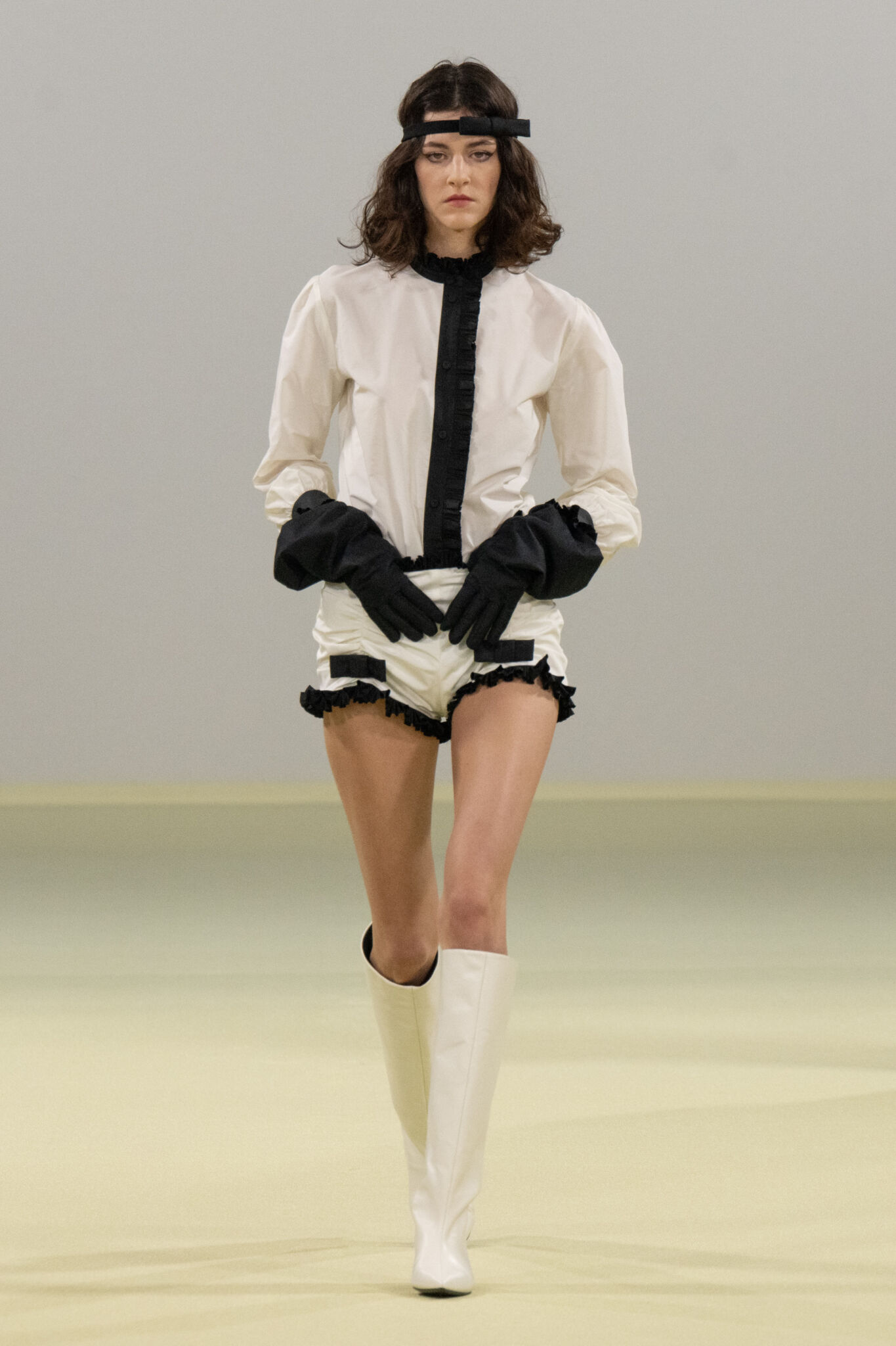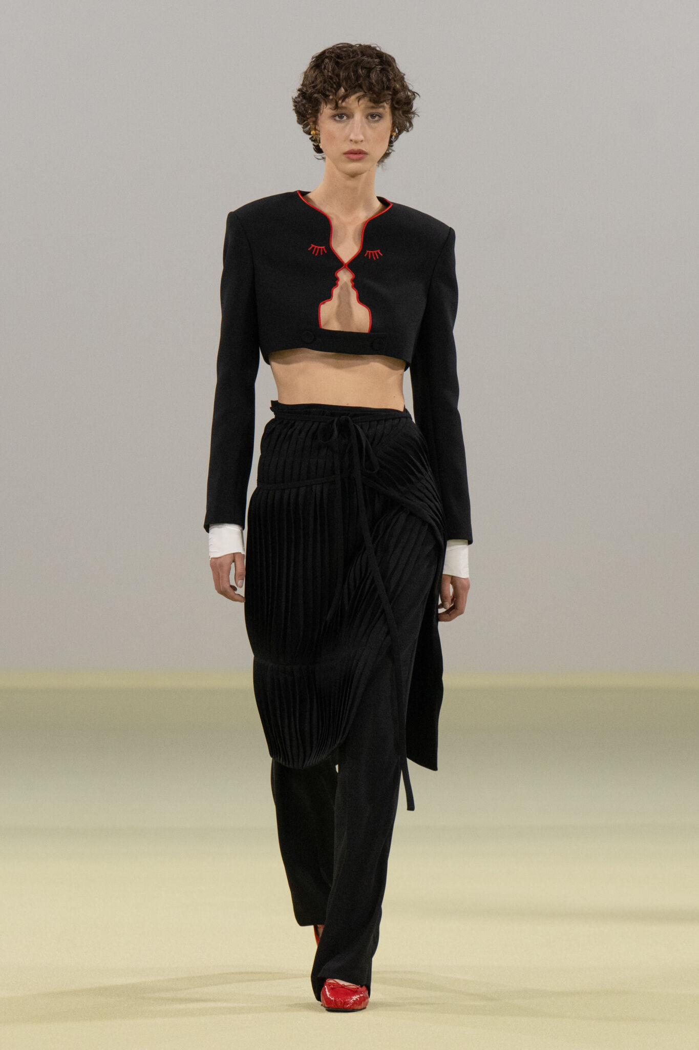 В основе концептуальной линейки лежит метод деконструкции: существующие предметы гардероба разбираются и собираются заново, обретая иную функцию и эстетику. Здесь платья превращаются в топы, а плотные тренчи трансформируются в жакеты и рюкзаки. Пальто точно следуют изгибам тела, жакеты с подчеркнутой линией талии моделируют силуэт, а смятая шерстяная саржа, зафиксированная контрастной строчкой, создает неровную трехмерность. Трикотаж усложняется гетерогенной сборкой, формирующей материальные паузы, а встроенная металлическая проволока усиливает драматургию объемов. Лишь 30% моделей созданы с нуля, остальные 70% — результат тщательной работы с архивом марки, доведенной до состояния, в котором исходные формы становятся неузнаваемыми, что свидетельствует не о редукции, а о зрелости подхода. Отказываясь от логики быстрого и массового производства, бренд утверждает осознанность и дистанцию от модной системы, предлагая вещи, требующие тактильного и внимательного диалога.