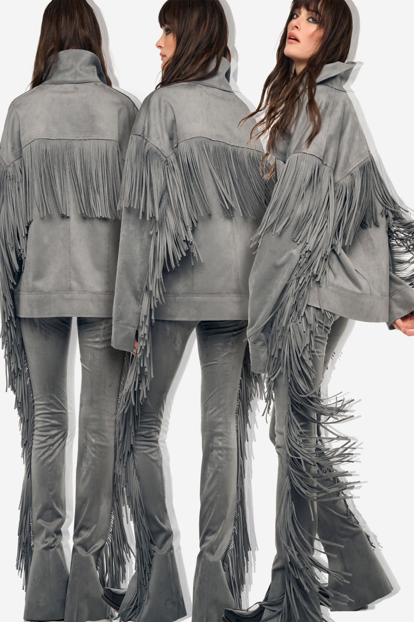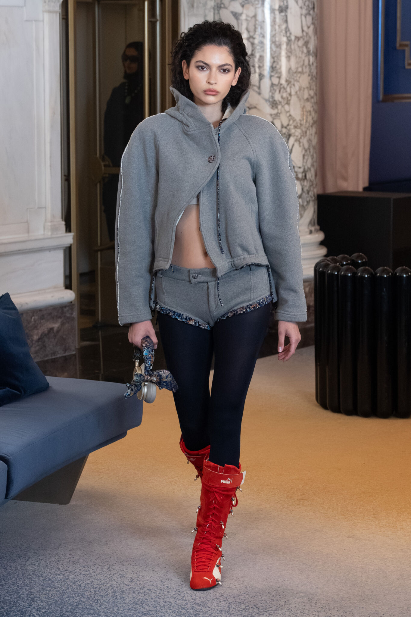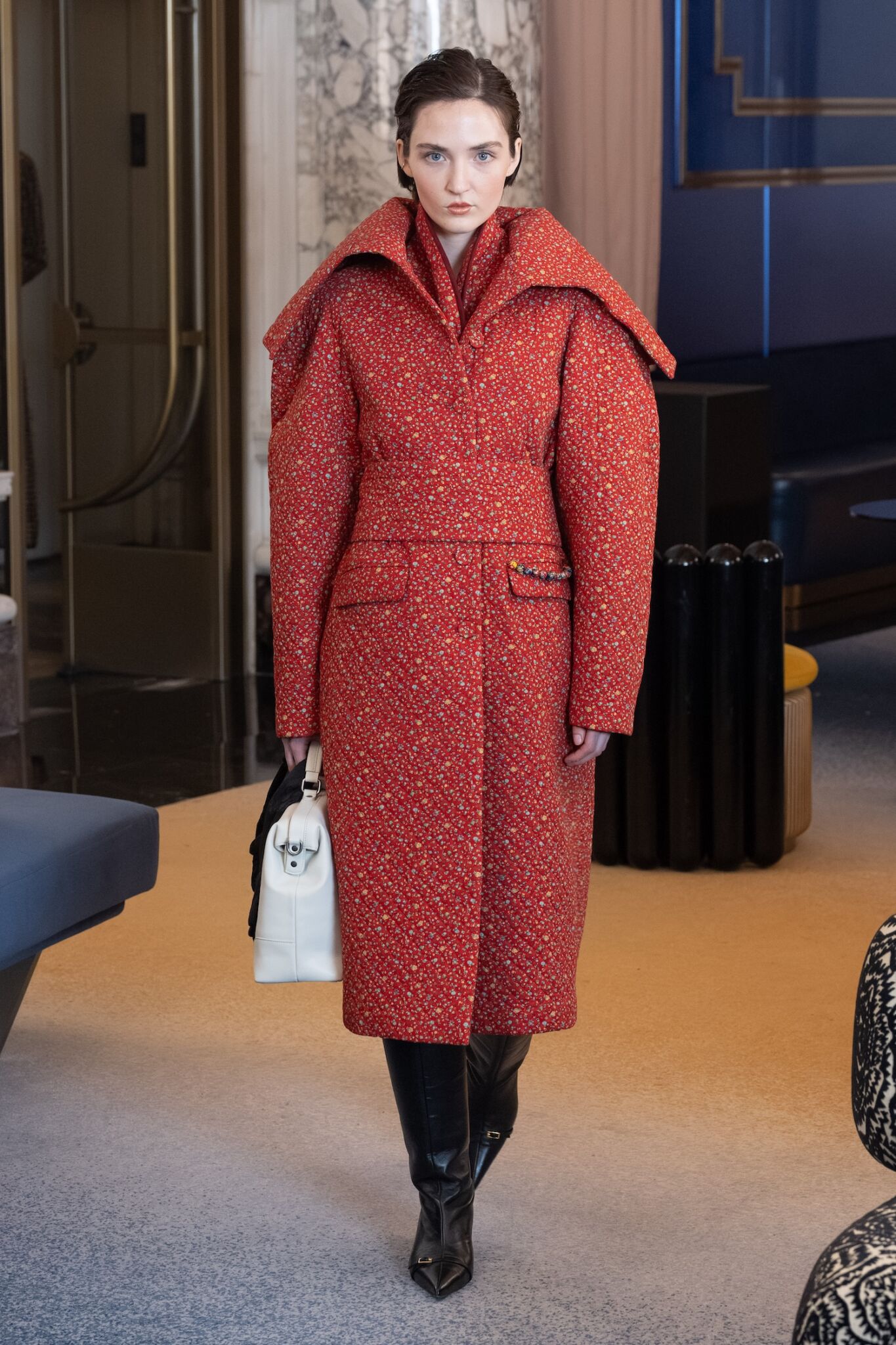 Американский дизайнер углубляет уже сформированный визуальный язык бренда, сосредотачиваясь на точности конструкции и внутренней логике формы. Металлические иллюзии становятся выверенными акцентами, подчеркивающими сложность кроя и особое внимание к драпировке, которая здесь выступает не декором, а архитектурной основой силуэта. Кашемир и тончайшая мериносовая шерсть придают скульптурным формам глубину и мягкую тяжесть, позволяя ткани свободно раскрывать пластику складок и линий. Коллекция производит впечатление сознательной концентрации: формы простраиваются через взаимодействие материи и тела, через ощущение веса, натяжения и движения в течение дня. Технологический слой презентации усиливает этот диалог, размывая границу между реальным и смоделированным. Существующие образы, надетые моделью, существуют на фоне сгенерированных ИИ пространств, создавая напряжение восприятия. Интерактивная часть с использованием SpeedShotX Visual AI Lens от Fiducia AI, а также виртуальные примерки переводят зрителя из роли наблюдателя в участника. Бартон стремится использовать цифровые инструменты как продолжение, а не замену физического мастерства.