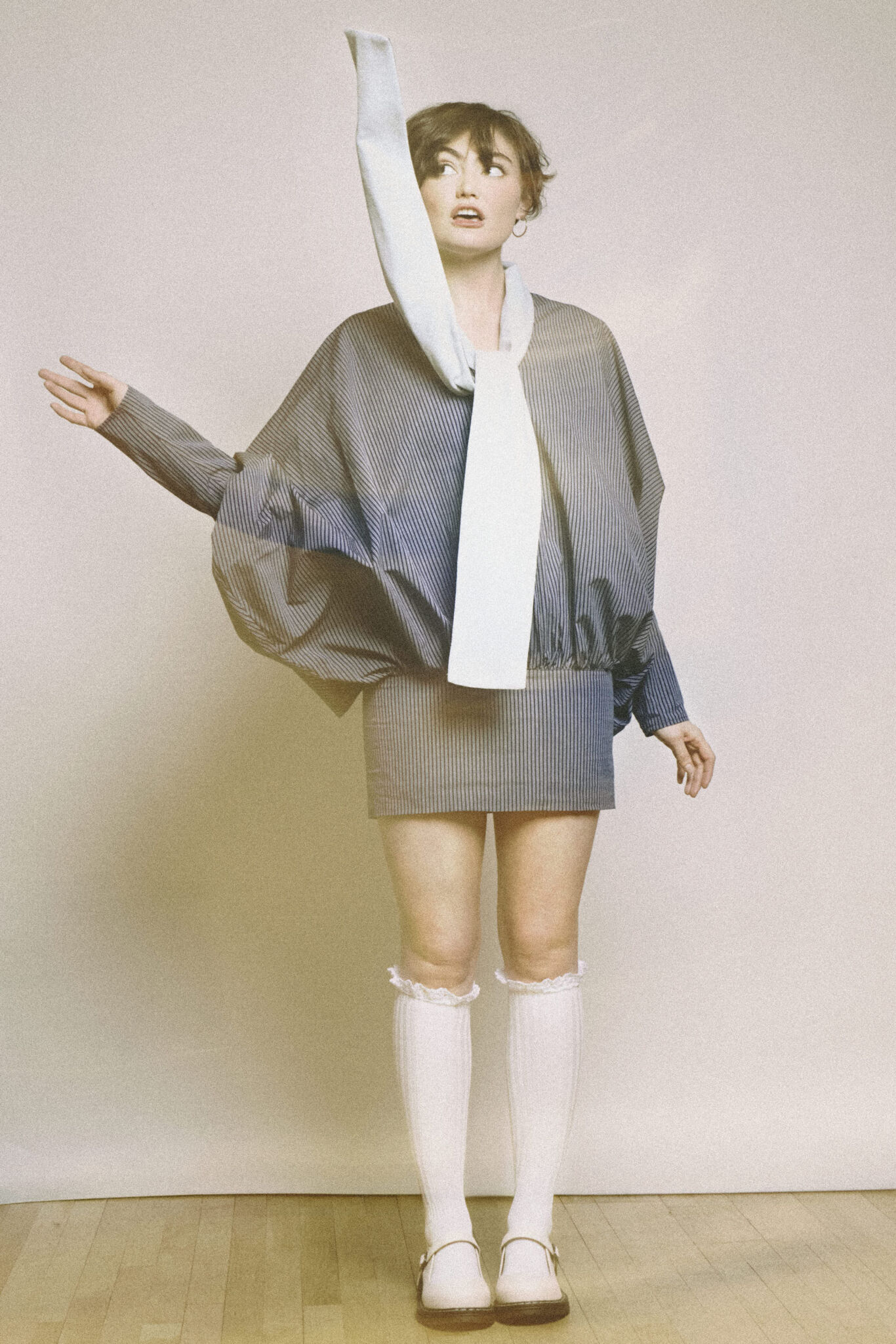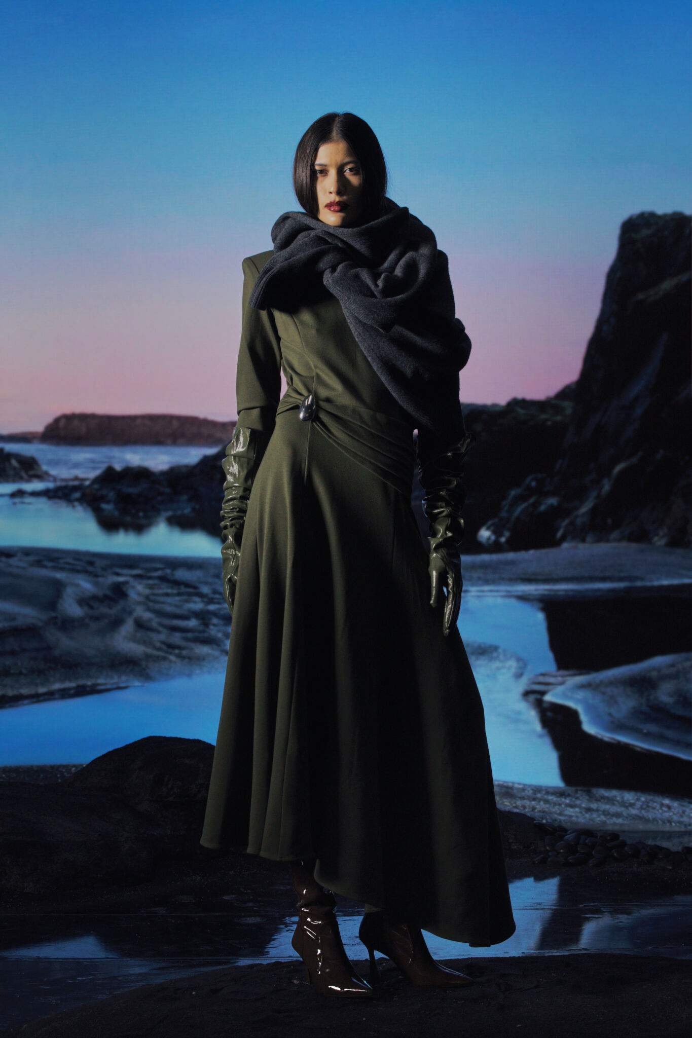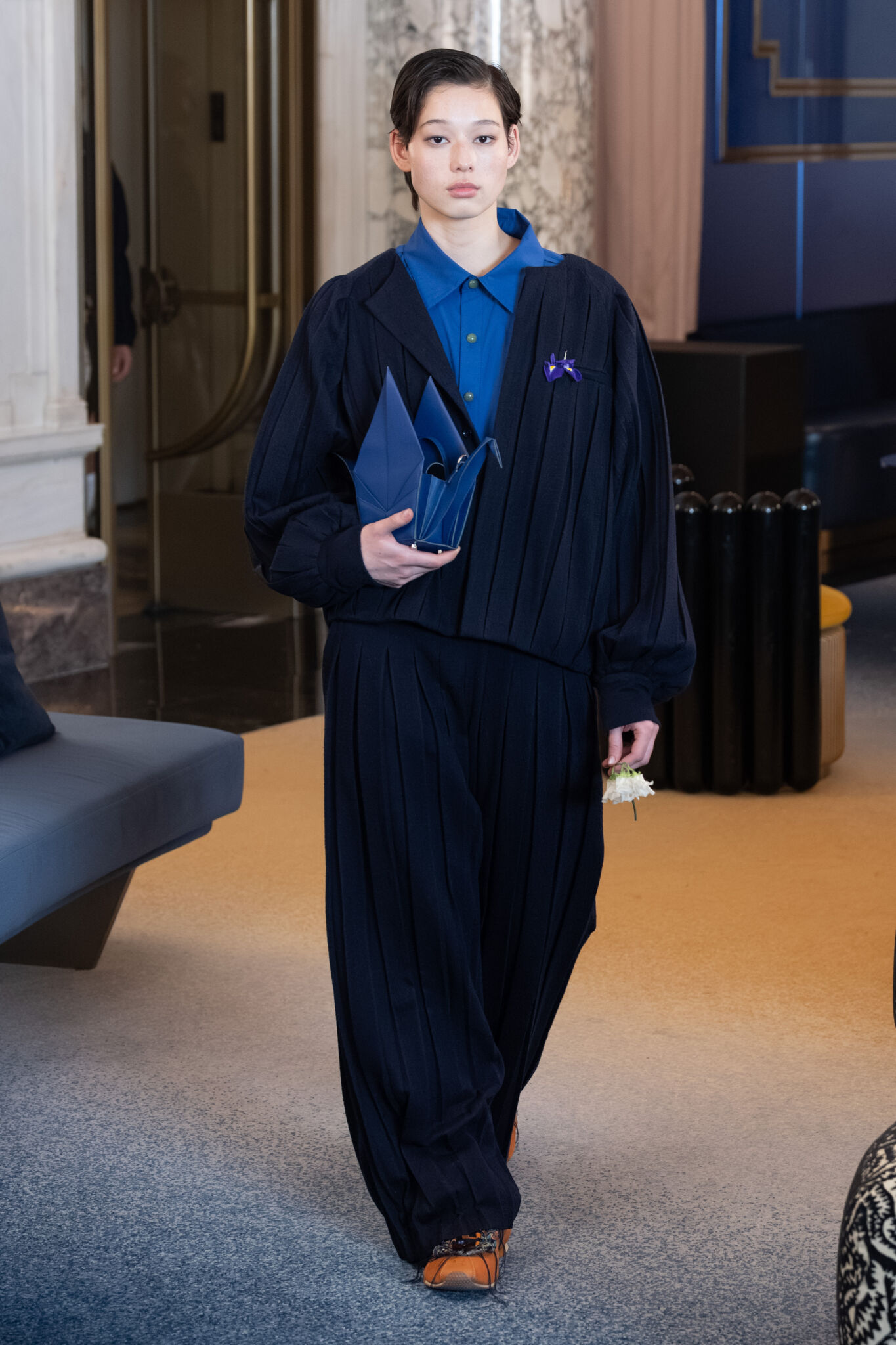 Вдохновленная садом ирисов Хорикири из гравюр Утагава Хиросигэ, коллекция стала для Акки Чжао поэтичным возвращением к японским корням, переосмысленным сквозь призму нью-йоркской реальности. Синий ирис, проходя через всю линию, является символом обновления, памяти и мимолетной красоты, формируя эмоциональный каркас презентации. Повествование выстроено как путь от семени к цветению: от образа «Flower Girl», олицетворяющего зарождение, к силуэту «Human Vase», выражающему полную трансформацию. Этот метафорический рост перекликается с личной географией дизайнера — Осакой, Чунцином и Нью-Йорком — где каждая точка стала частью ее художественного языка. В основе лежит тонкая работа с ремеслом: китайская парча сочетается с открытыми швами и намеренно растрёпанными краями, которые меняются в движении, придавая традиционным тканям современную динамику. Японские техники плиссировки формируют скульптурный ритм платьев, пальто и костюмов, а фирменная S-форма мягко намекает на баланс инь и ян, соединяя Восток и Запад, прошлое и настоящее. Идеально завершают образы пояса и драпировки с отсылкой к кимоно, обувь, созданная совместно с Helena Mar, а также нефрит, пресноводный жемчуг, фарфоровые пуговицы и сумка-оригами в виде журавля.