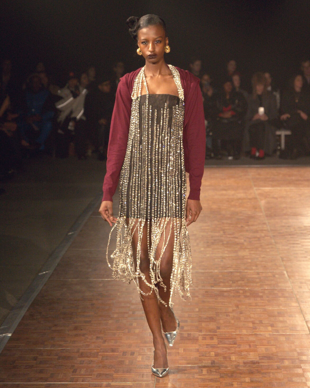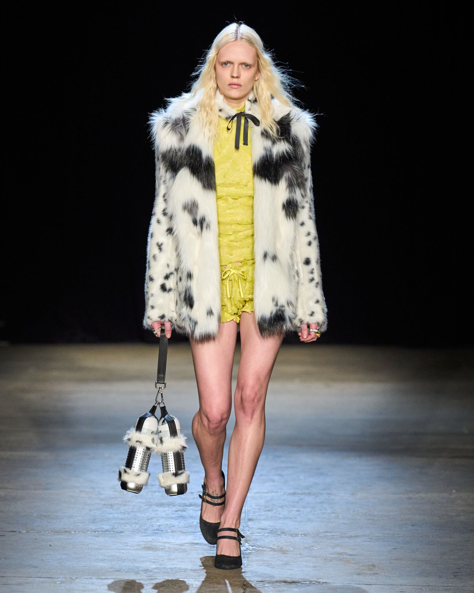 Николас Аберн продолжил выстраивать собственный визуальный нарратив, соединив игривость, гламур и ощущение сценического праздника. Для новой коллекции он рассматривает роскошь не только как блеск, но и как форму силы — способ управлять впечатлением и обретать самостоятельность через образ. Показ, отсылающий к легендарному нью-йоркскому клубу Area, стал оммажем эпохе 1980-х с ее театральностью и дерзкой энергией. Джинсовые куртки с гипертрофированными поясами-бантами, регбийки с удлиненными краями, небрежно наброшенные на плечи, и микромини с акцентными деталями напоминали костюмированные перевоплощения. Личные воспоминания нашли отражение в винтажных шелковых платках, превращенных в яркие комплекты, и в худи, переработанном в эффектное платье. Экспериментальный гламур проявился в «страусовых» перьях из старых футболок, оборках из магнитной пленки кассет и золотых лентах, словно зависших между слоями тюля. Дополняли картину расшитые юбочные костюмы с принтами губ в духе поп-арта, мини-юбки и платья из ламе с рюшами, развернутыми «наоборот».