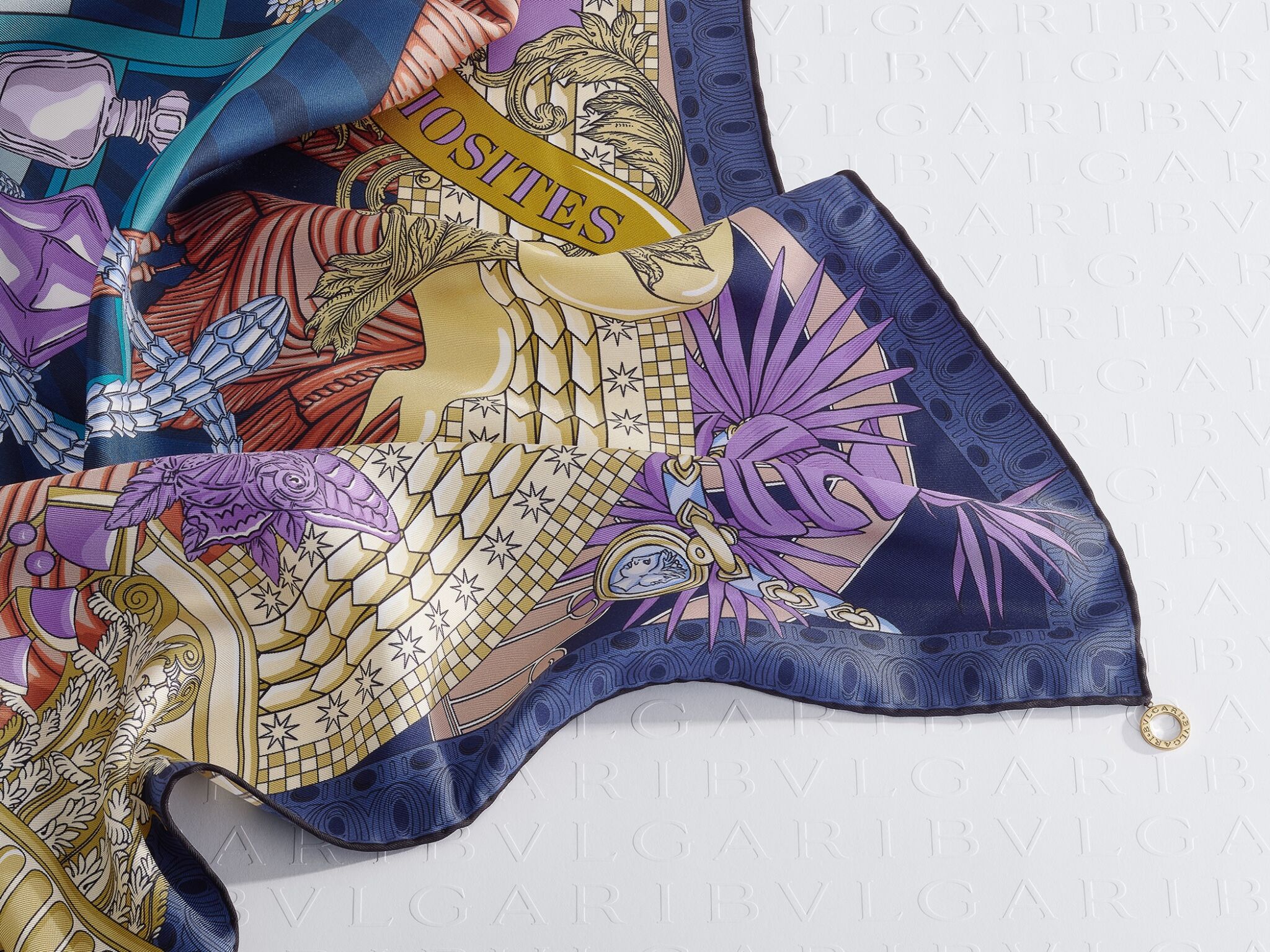 В текстильной коллекции появился дизайн Cabinet des Curiosités — тонкая отсылка к исторической «лавке редкостей» Дома. Знаковая змея Serpenti и архитектурные линии Рима складываются в воображаемый кабинет сокровищ — будто рисунок приглашает рассматривать его деталь за деталью. Платки из 100% шелка создаются в Комо, центре итальянского текстильного искусства, и выходят в разных цветовых вариантах — от спокойных до более насыщенных.