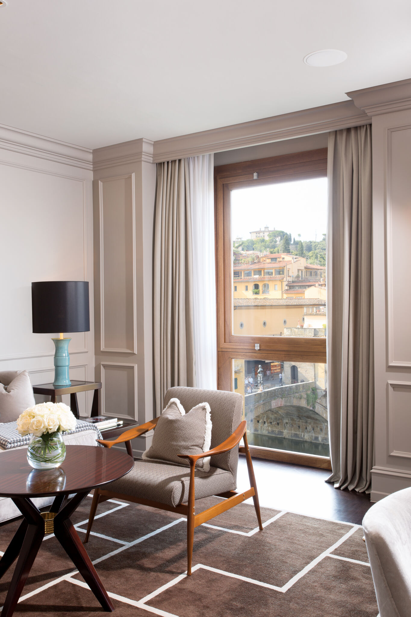 Гости Portrait Firenze обладают особой привилегией не расталкивать туристов на набережной Арно, чтобы сделать удачный кадр с одним из символов Флоренции, а просто видеть его утром, нежась в комфортной кровати, с собственной террасы, где приятно устроиться с чашкой эспрессо, укрывшись кашемировым пледом, или с кораллового дивана на террасе ресторана Caffè dell’Oro, выходящего прямо на пешеходную часть набережной. Создавая 37 стильных люксов, архитектор и дизайнер Микеле Бонан черпал вдохновение в традициях флорентийских ремесленников. Интеллектуальную простоту классики и современные линии дополняют коллекционные ткани и натуральные материалы, такие как лен и кашемир, дерево и кожа. Ювелирные детали, ширмы в стиле шинуазри, всплески бирюзового, благородство золота, и, конечно же, виды с террас на реку Арно, делают особенным каждый день, проведенный в Portrait Firenze. Архитектор Микеле Бонан соединил в интерьерах матово-серый и сияющий серый (специалисты искали точный оттенок серого из сотен вариантов), деревянные полы цвета горького шоколада, сталь и матовое золото. Микеле «охотился» за тканями, которые были бы «теплыми» и приятными на ощупь.