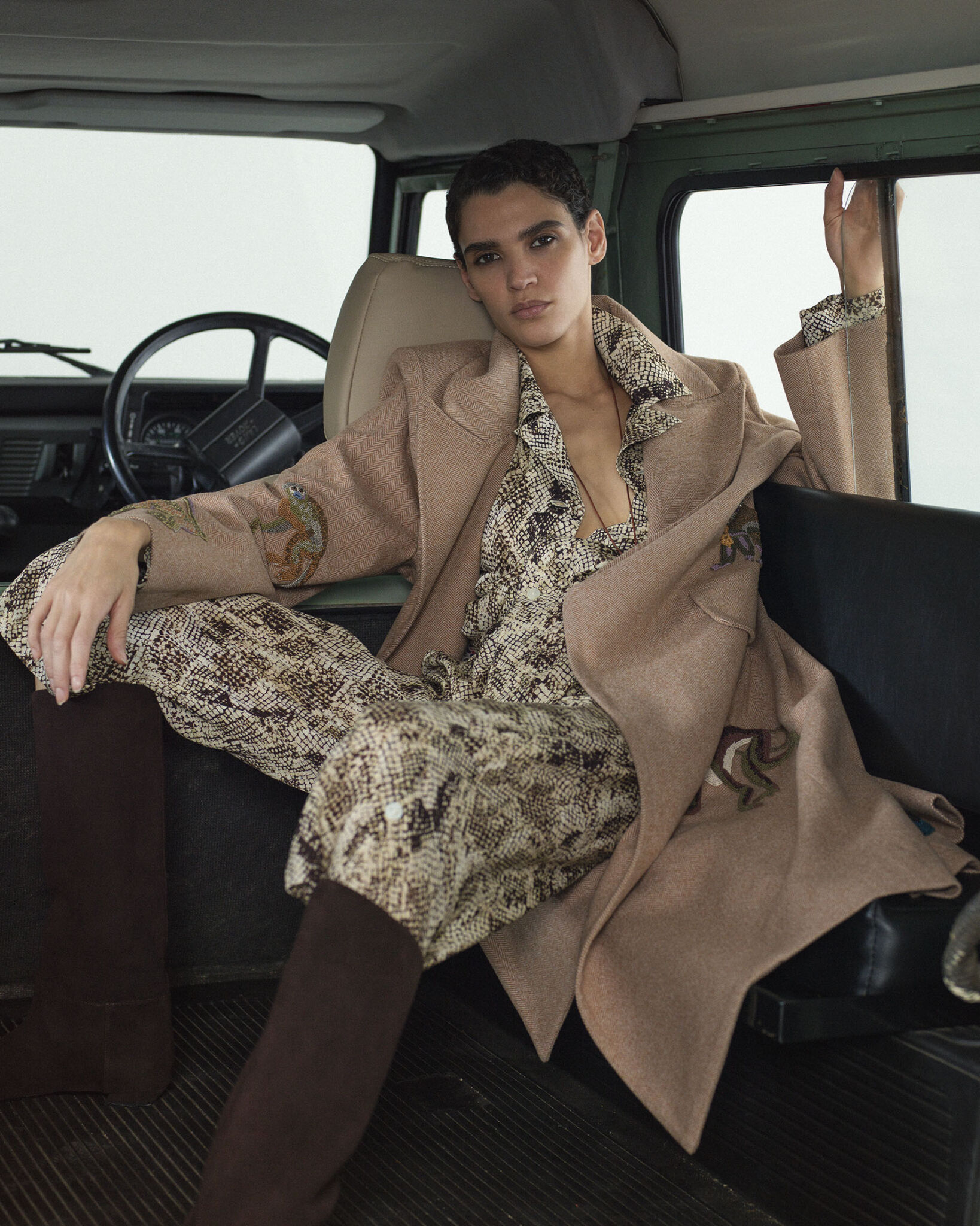 Тактильность выходит на первый план: соединяются вязаная шерсть, шелк ручного ткачества, твид с бисерной аппликацией и керамические пуговицы ручной работы, отсылающие к семейной истории и ремесленной традиции. Вдохновленная смелым духом 1970-х, эта линейка обращена к женщине, чей стиль стал ее второй природой — уверенной, свободной и готовой к любому приключению.