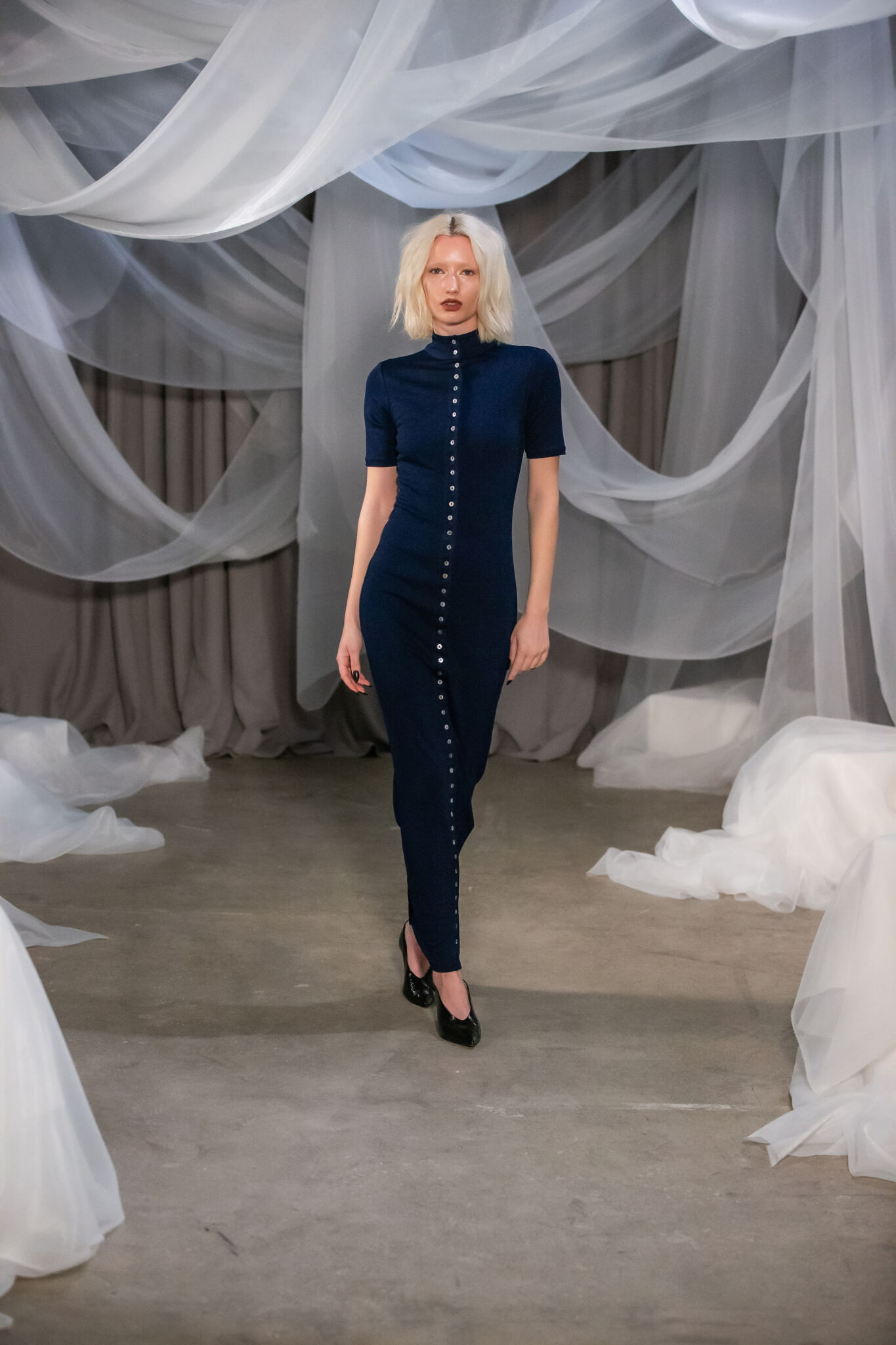 Силуэты, выполненные в глубоких, насыщенных оттенках, не столько украшают фигуру, сколько фиксируют момент, оставляя эмоциональный след и утверждая тихую, но уверенную доминанту присутствия. Личный опыт дизайнера, как иммигрантки первого поколения в США, превращает коллекцию в акт сознательного созидания — попытку выстроить собственное наследие там, где его прежде не существовало.