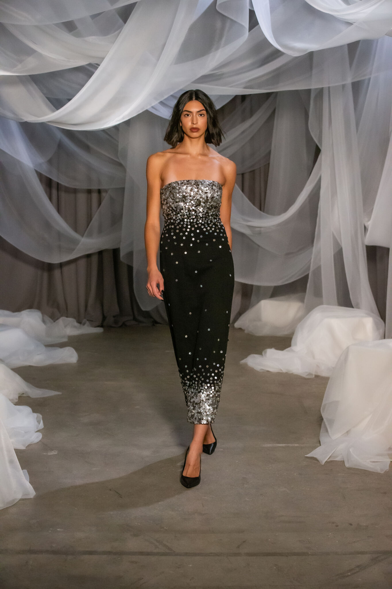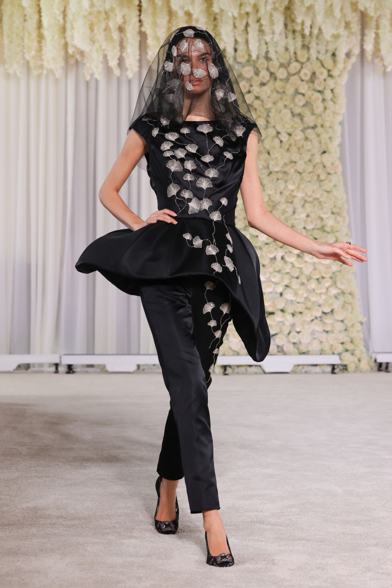 Фактурное разнообразие — шантильи-кружево, твид, тюль, шифон и металлизированная веганская кожа с лазерной обработкой — стало главным выразительным инструментом, создающим эффект глубины и движения. Андерсон переосмыслил «маленькое черное платье»: от строгих твидовых мини с кружевными вставками до провокационных полупрозрачных моделей с графичной архитектурой.