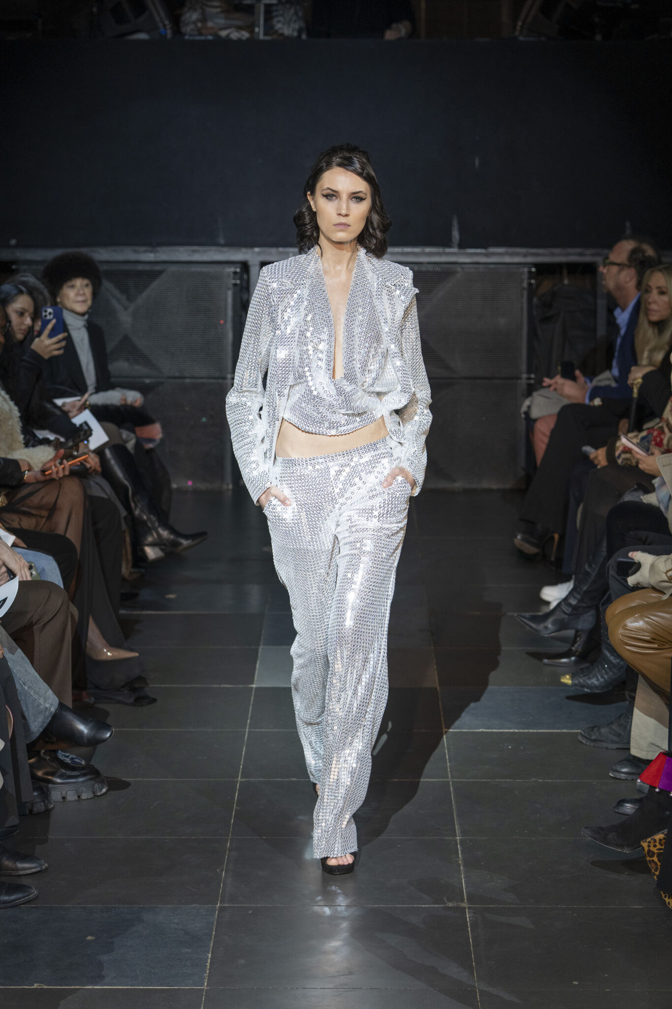 Металлические геоды, «доспехи» и чеканные бордюры придают силуэту воинственную точность. Палитра варьируется от шампанского и опалового до антрацита, ночного синего и глубокого бордо. Завершает повествование серия вечерних образов, где каждая деталь мерцает как часть единой электрической галактики.