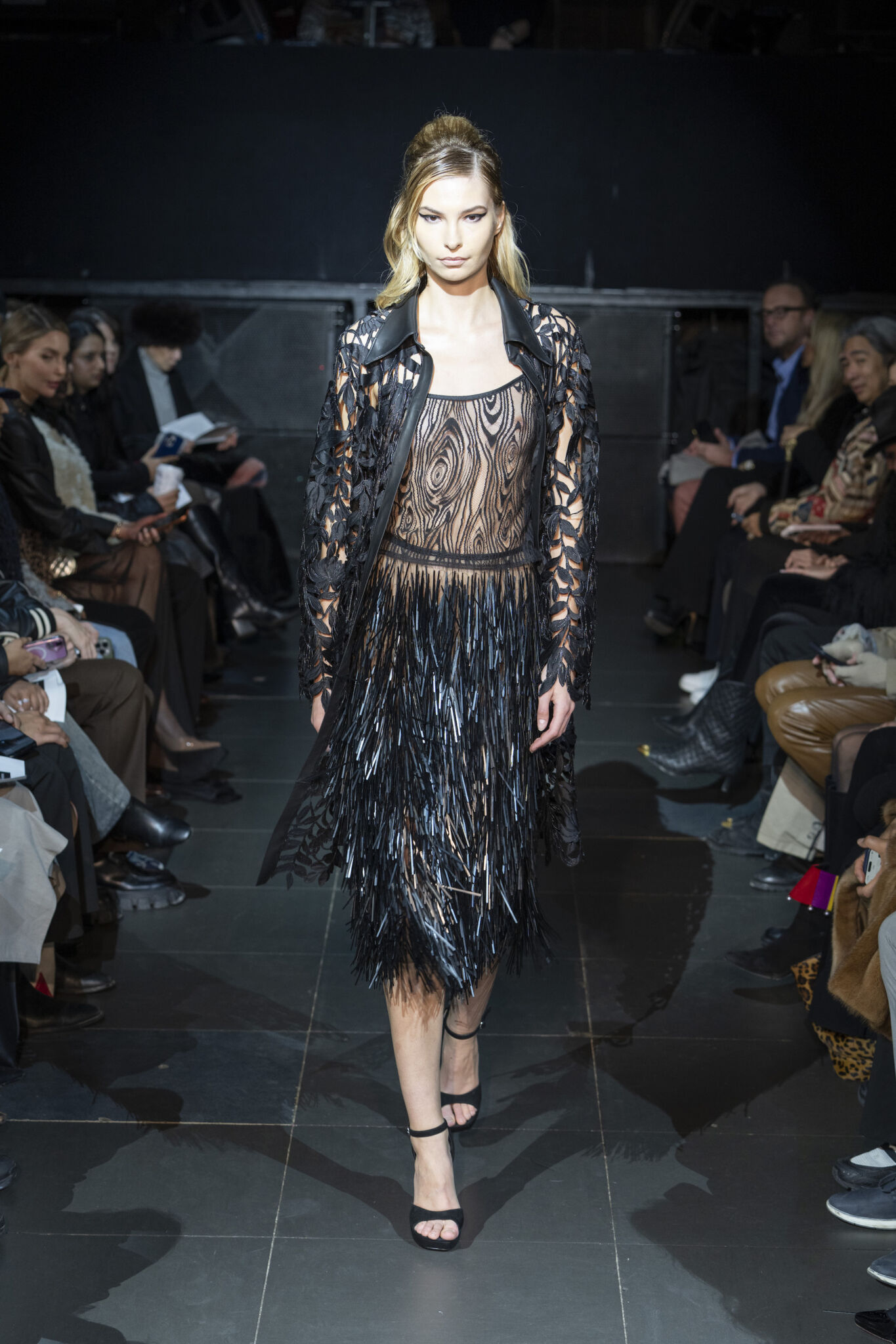 Линейка «Nouveau Art Deco» раскрывается в архитектурных пальто-кафтанах, жакетах и скульптурных смокингах, дополненных прозрачными боди и кружевными топами. Контраст фактур становится ключевым приемом: веганская кожа соседствует с бархатом, жаккард — с шантильи и тюлем в деликатных градациях. Особое внимание уделено трансформируемости — съемные рукава, накидки и керчифы позволяют образам менять характер от камерной чувственности к драматичному блеску.
