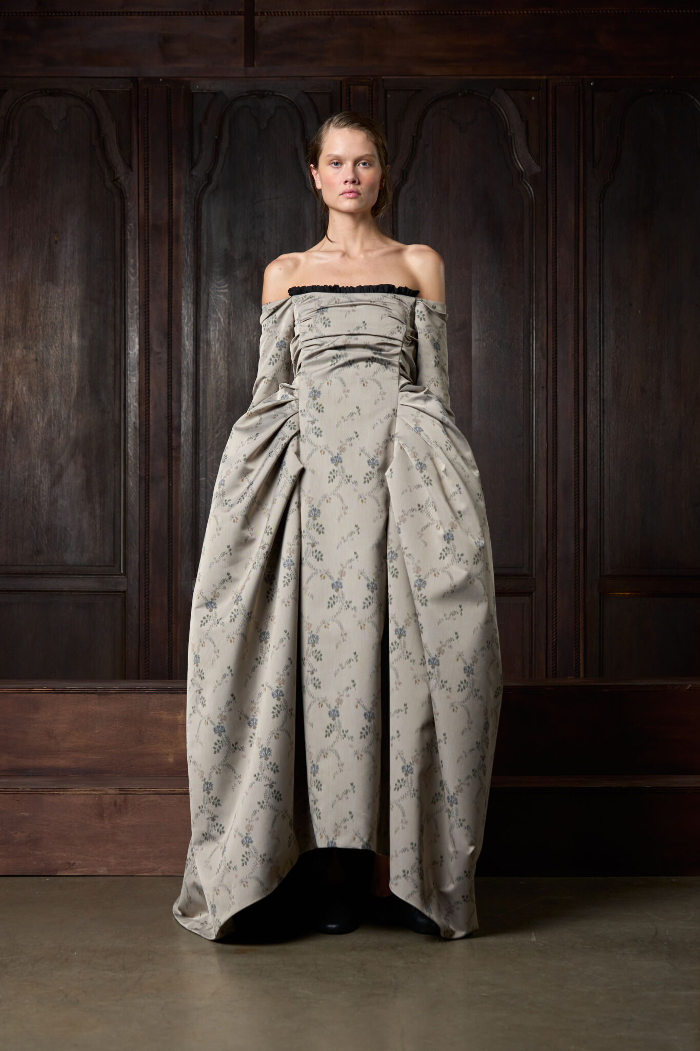 Продолжая исследовать скульптурные формы, Meruert Tolegen выделяет цветочный дамаст с уточным переплетением. Из него выстроены силуэты с панье и выверенным кроем, придающие образам архитектурную выразительность.