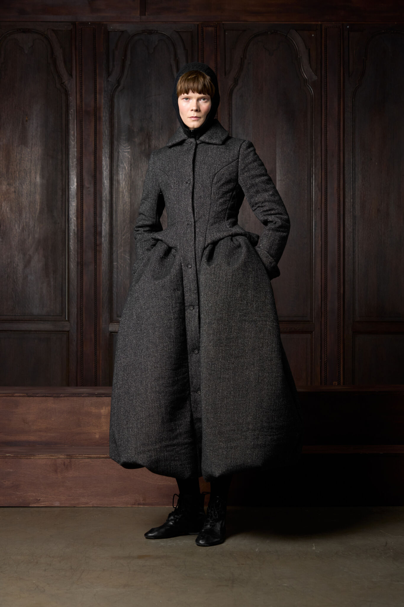 Шерстяной «елочный» драп варьируется от мягко моделированных линий до жестко очерченного тейлоринга, вступая в контраст с неожиданными материалами — синтетическим волокном, имитирующим «Monkey Fur», и ручными кашемировыми наслоениями.